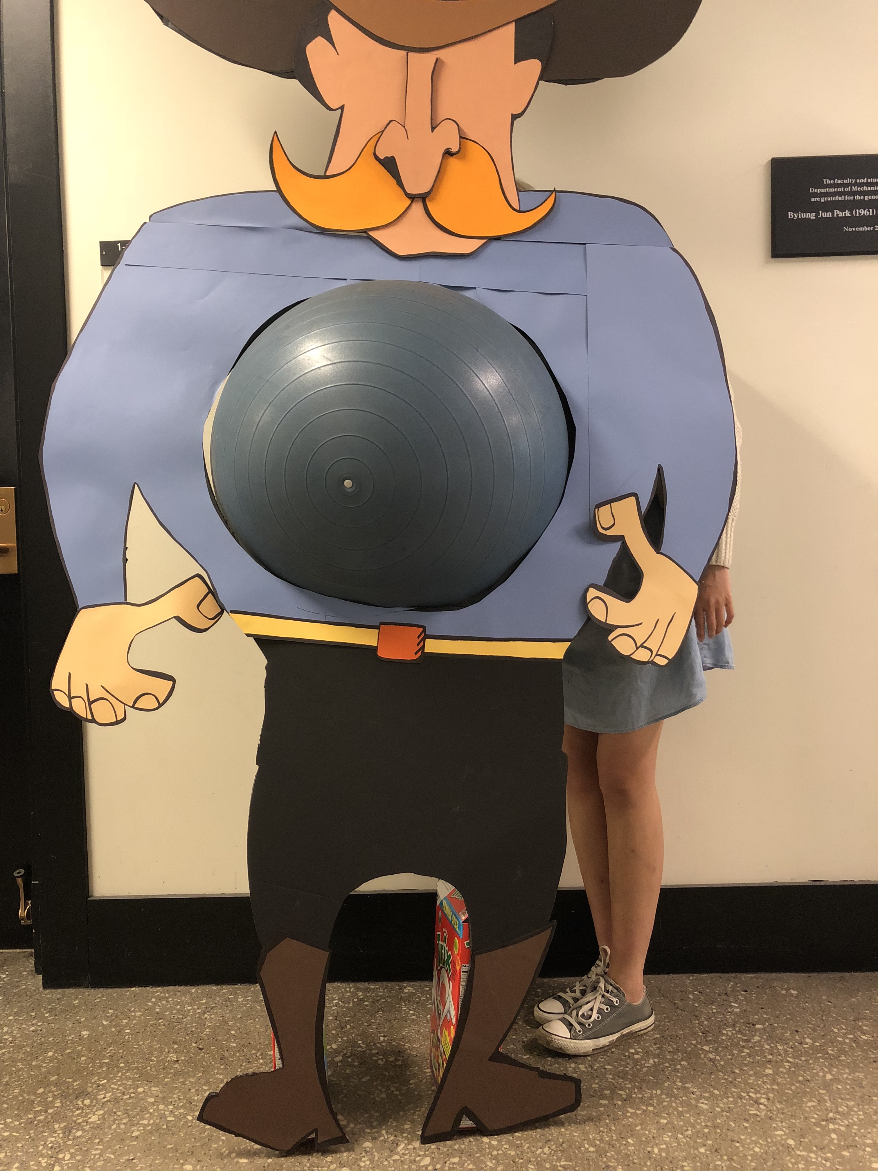 One of the sheriffs that would be lining the walls of a Wild West "Beer Belly Bounce" room. While hanging from a swing track or zipline, bounce off the sheriff bellies to propel yourself across the room. The sheriff here stands around 7.5-8ft tall. I wanted the sheriff to be taller than average human height, to make him more imposing and to make the room more immersive. I wanted the sheriff to have a top-heavy shape, to accomodate for the belly, and to give him a more humorous body shape.