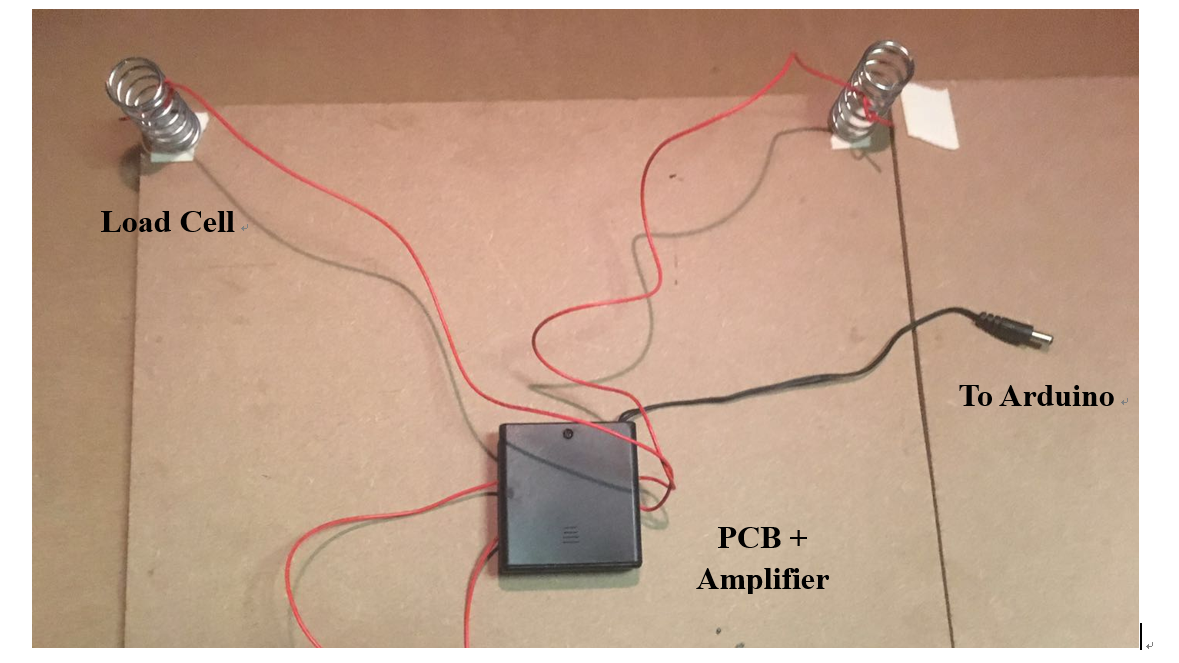 A simulated internal structure of the circuit assembly is shown below. As the load cell receives load from the player, related voltage signals are sent to the PCB board, amplified and then sent to the Arduino so that the Arduino could operate switches.