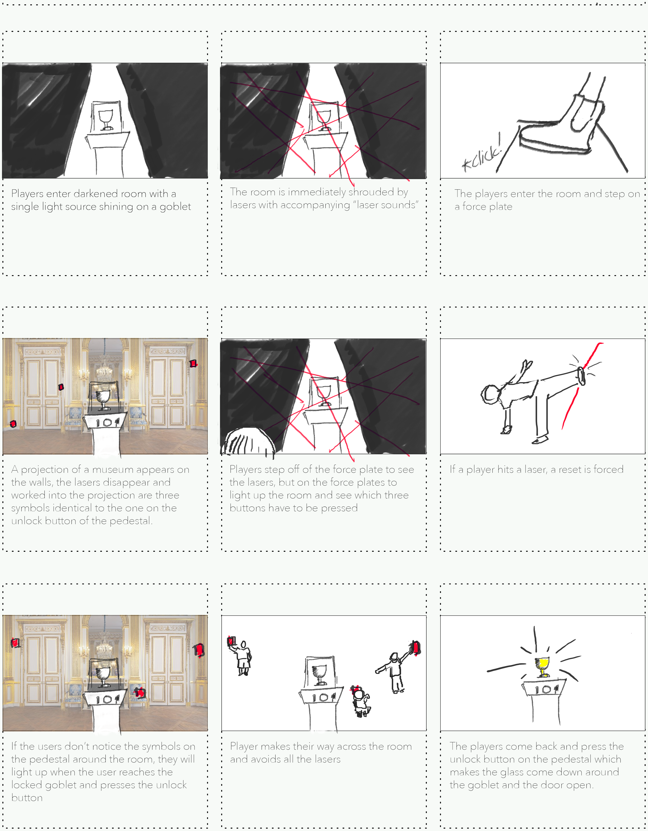 In The Acrobat storyboard, guests have to press three switches to turn off the laser grid surrounding the goblet they have to attain. The visual indicator for the location of the switches can only be seen when the pressure sensitive tile is pressed and the room is "lit up". If a guest trips a laser, a new set of three switches will now need to be pressed. The goal is to place 24 switches around the four walls of the room and have only 3 light up at once. Once the laser is tripped, three other, random combination of lights will light up.