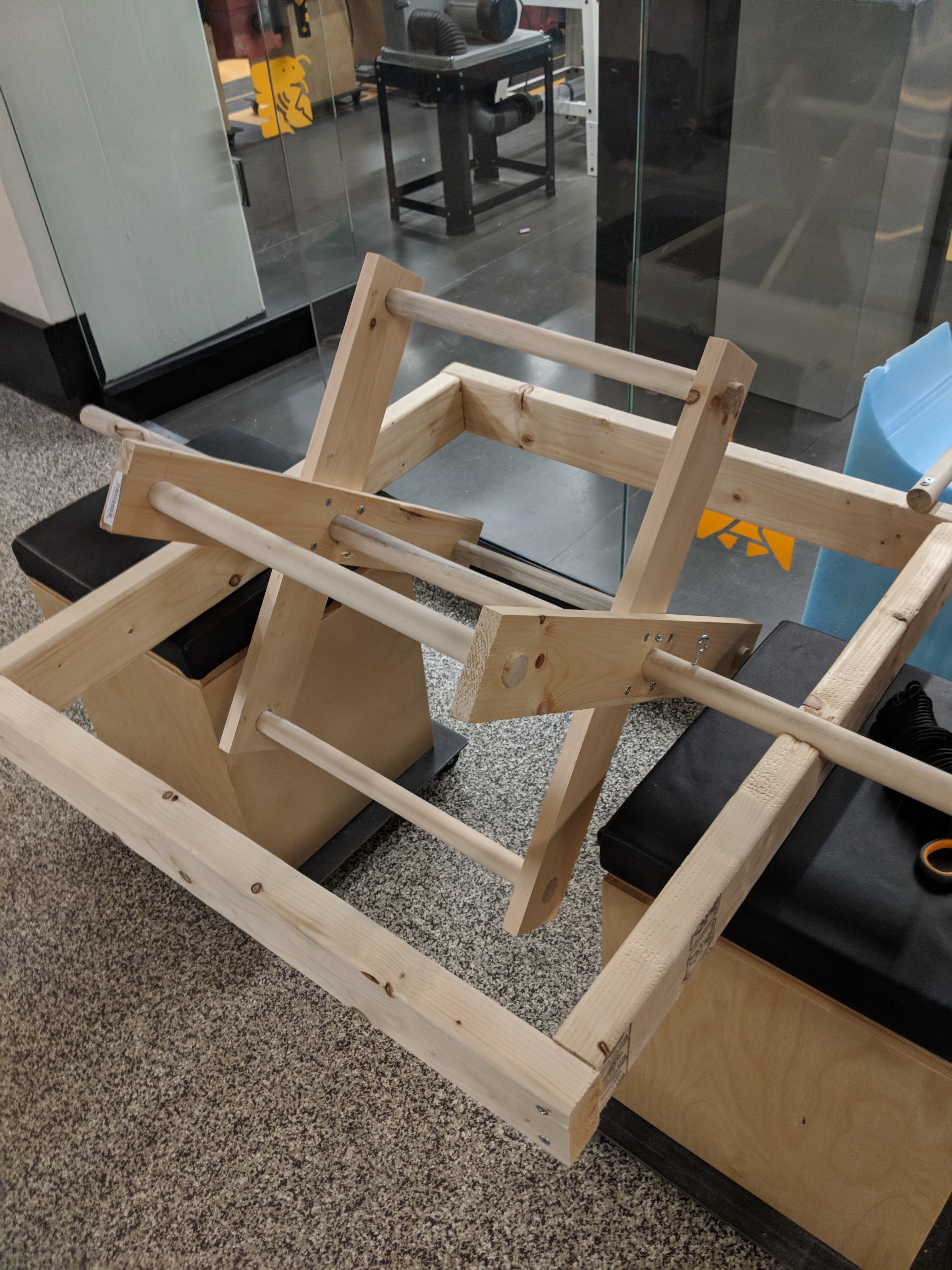 The rotating bar consists of an interior dowell 1-1/4” thick and outer dowels of 1-1/8” supported by 1x4’s, while the support structure was made entirely of 2x4’s.