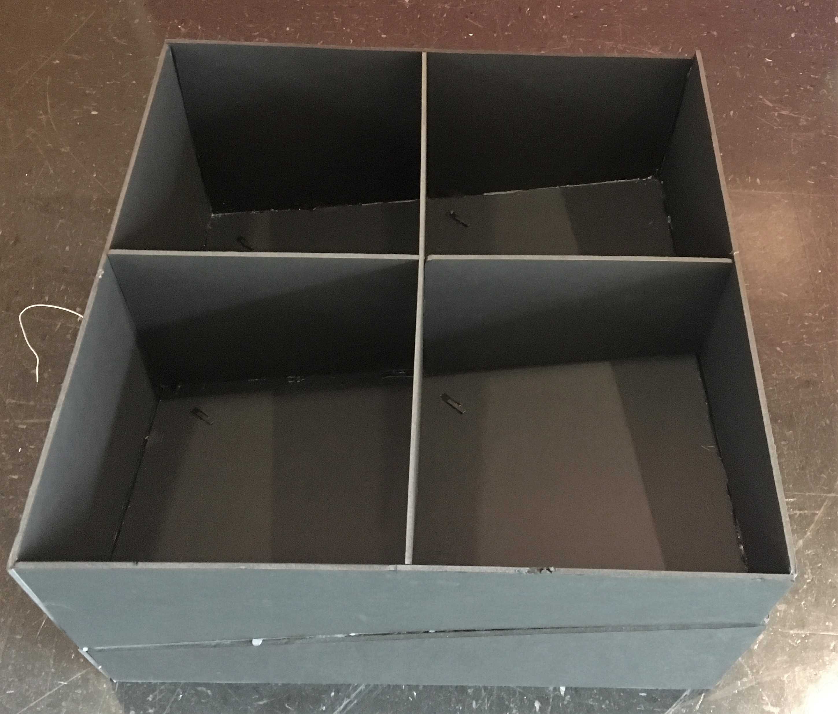 For this sketch model, only a 2x2 grid was constructed in an effort to evaluate the feasibility of the concept of hit detection. Below is an image of the completed design, which is composed of four equally sized squares constructed of foam core.