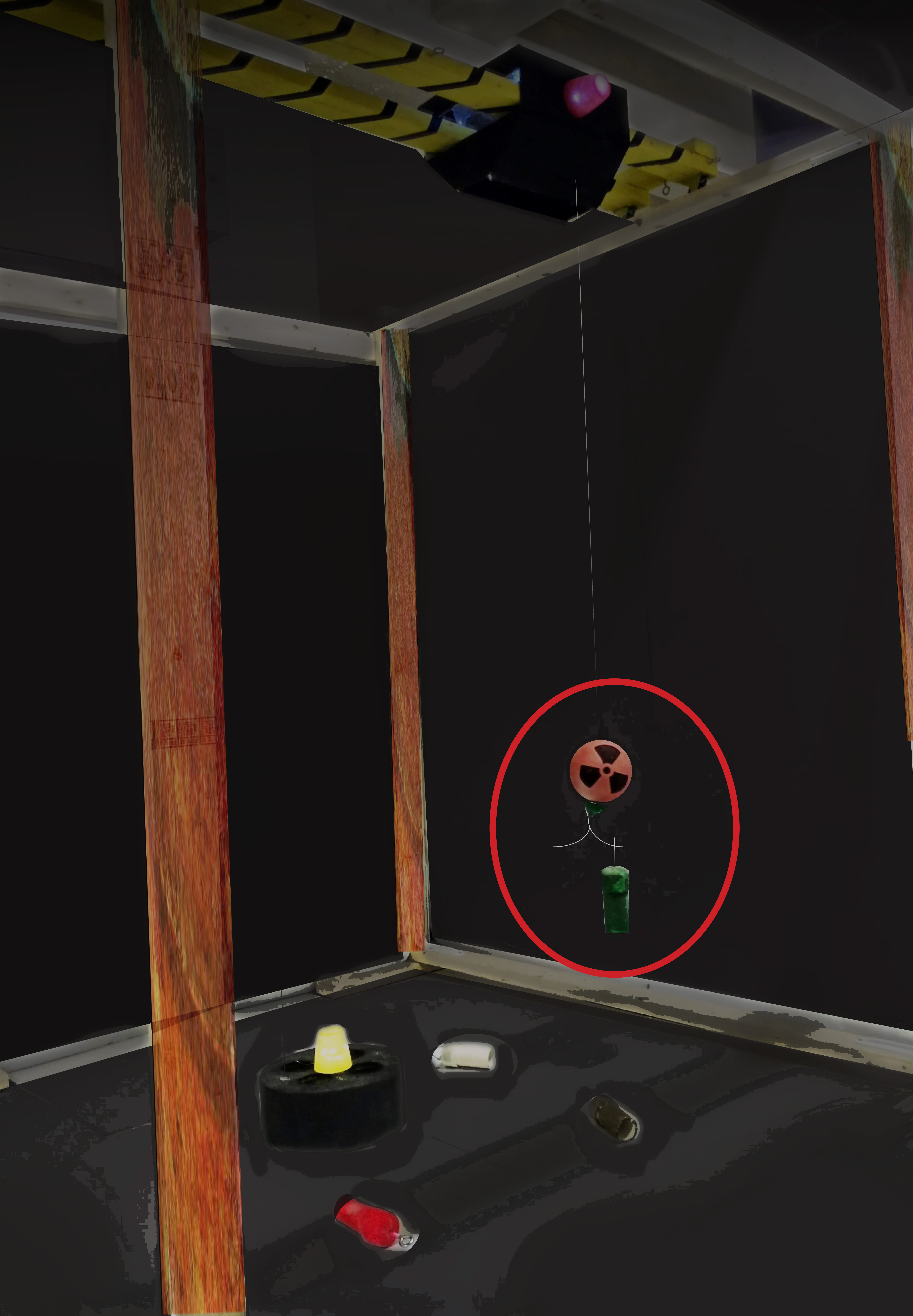 Image below depicts the dark ambience of the nuclear core and crane operating room, basing on the storyboard of "Meltdown Mayhem". (Please click here for the original storyboard). Here, we will illustrate the mechanism of the sphere and hook circled in red.