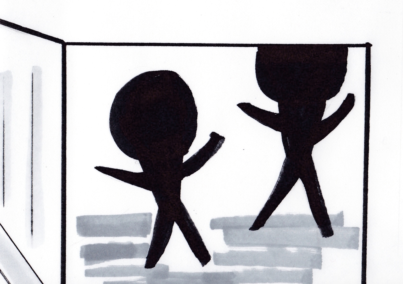 1. Players enter an empty room with walls covered with old posters. There's a barn door at the end, so they decide to check it out.
