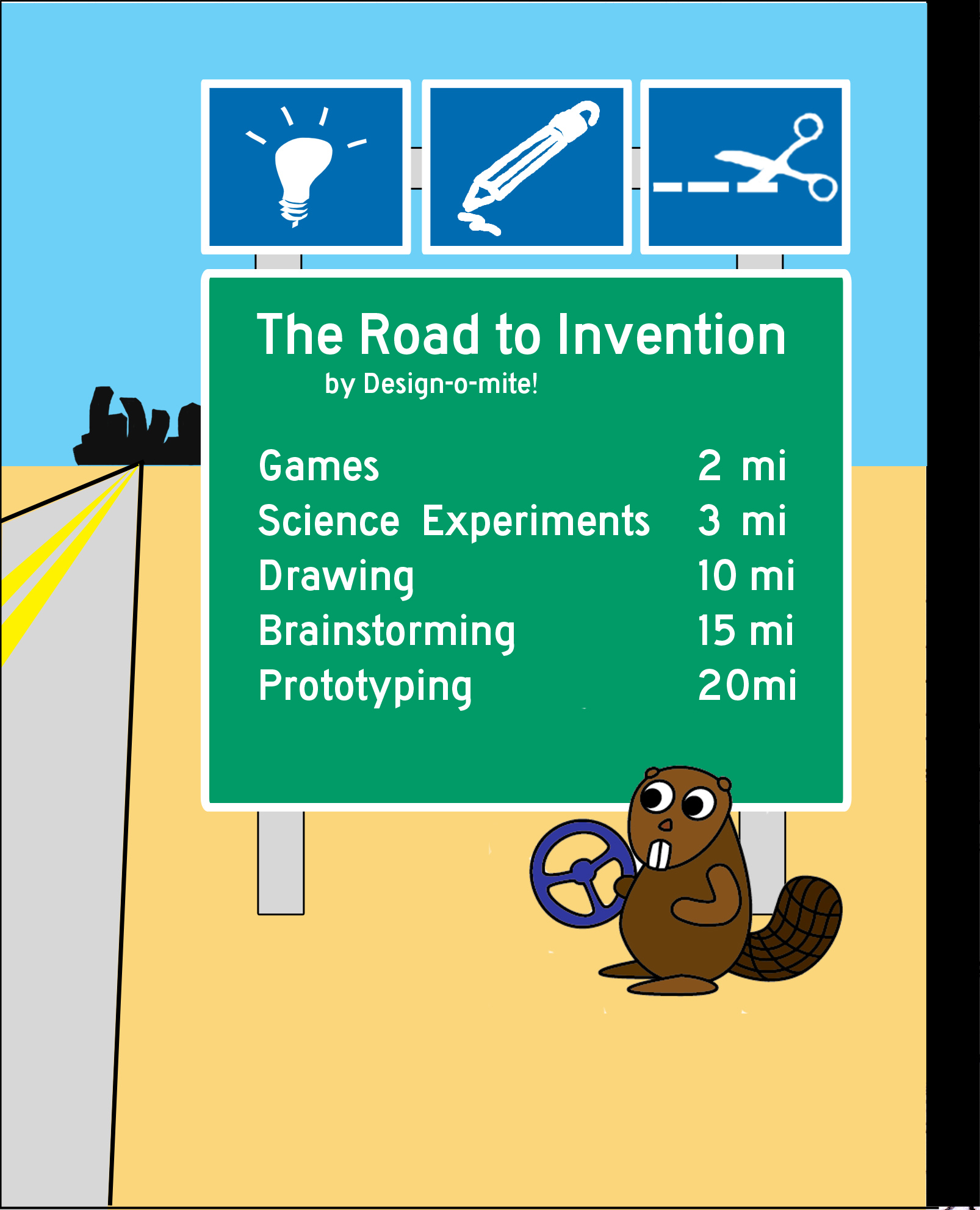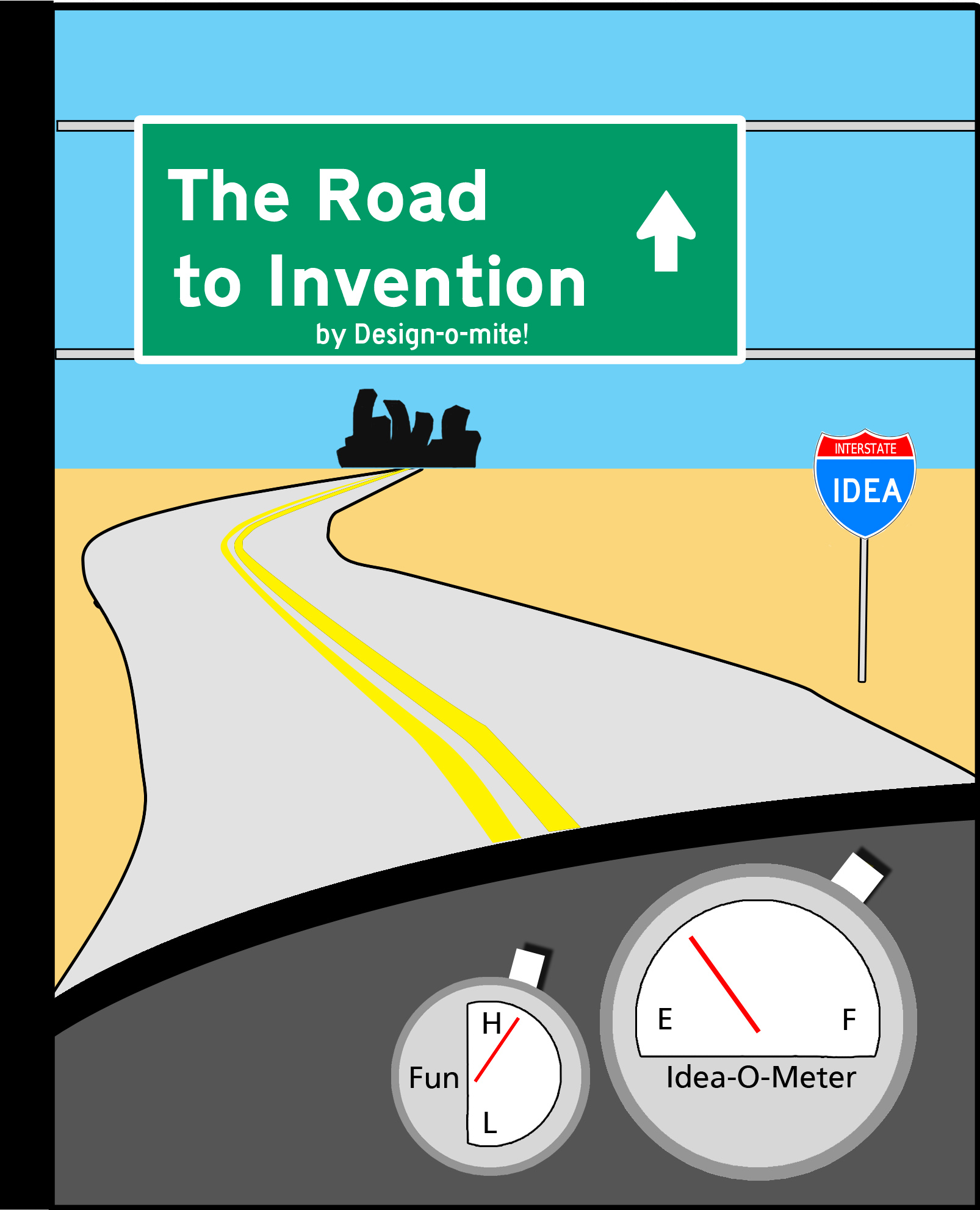 This direction or the invention notebook focused on establishing a theme and a cover design. This concept refinement was targeted for children and envisioned the design process as a journey. As such, the title "The Road to Invention" was used. This led to the iconography and symbols from Highway signs. The ront cover is the view from inside a car on the idea highway. The Idea-o-meter and un levels can be changed through manipulation of the paper dials. The tabs on the side can be rotated. The symbols would be used throughout the book to identify different activities and stops on the idea highway. The journey would be guided by the time the beaver narrator, shown on the back cover. The back cover again shows the content in the book in the form of signage. The blue icons oten used to indicate hotels or food on the highway would be used to indicate different types of activities. In the examples on the back cover, the lightbulb could be used on ideation prompts, the pencil for sketching, and the scissors for construction activities. The intention of this design was to use highway symbols which are easily recognizable in a cartoony way to make the "journey" of the design process more fun. This is also an exploration of a possible unifying theme for the form language in the notebook.
