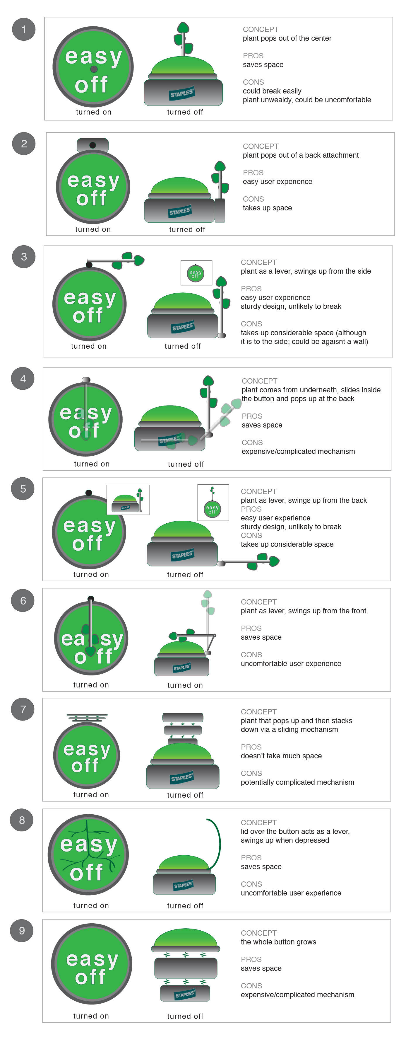 The Easy Button is a wired system that allows users to turn off the power from any outlet. This page shows various iterations of the design of the easy switch.