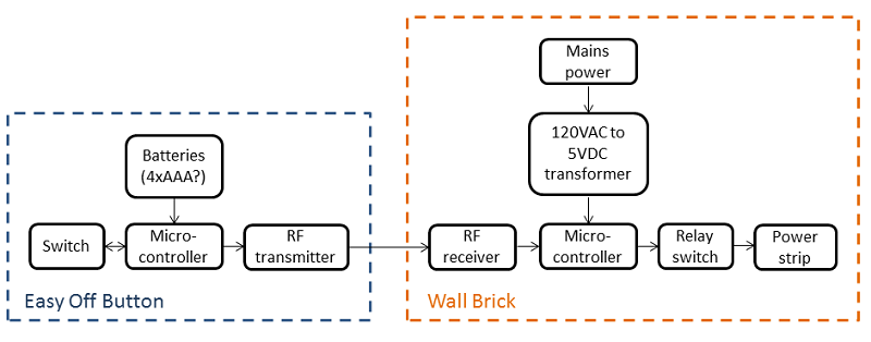 Pressing the Easy Off Button will send a signal to the button's microcontroller, which will make the RF transmitter send out a message. On the outlet junction, the RF receiver will capture the signal and send it to the brick's microcontroller, switching the relay to allow electricity to flow through the controlled power outlet, where the user's devices are plugged into.