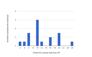 We then asked if users would buy an Easy Off button implemented on a single plug. We asked them how much they would be willing to pay for one, and we asked them how much they thought an average American would be willing to pay for one. On average, our friends were willing to pay the same thing for the single plug as the power strip, $11.50. However, they thought the average American would pay less than that for the single plug item, only $11.10.