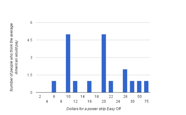First, we wondered if users would buy an Easy Off button implemented on a power strip. We asked them how much they would be willing to pay for one, and we asked them how much they thought an average American would be willing to pay for one. On average, our friends were willing to pay $11.50 for a power strip version of the Easy Off, and that the average American would pay nearly twice that, $22.33. Interestingly, some people thought the average American would be willing to pay up to $75 for a power strip Easy Off!