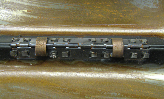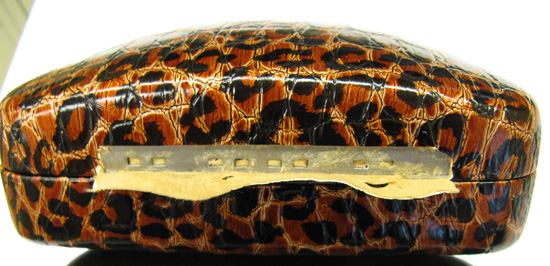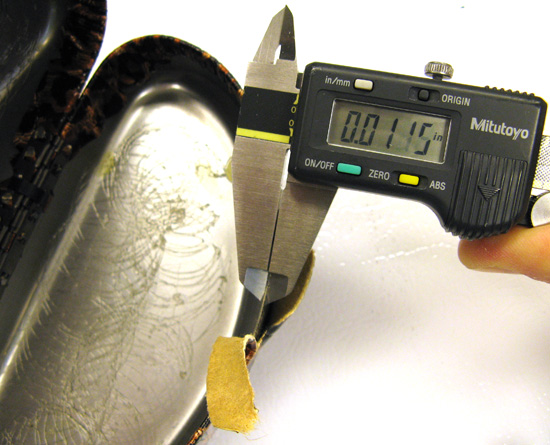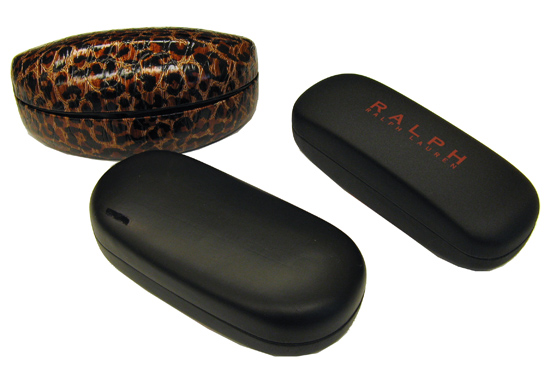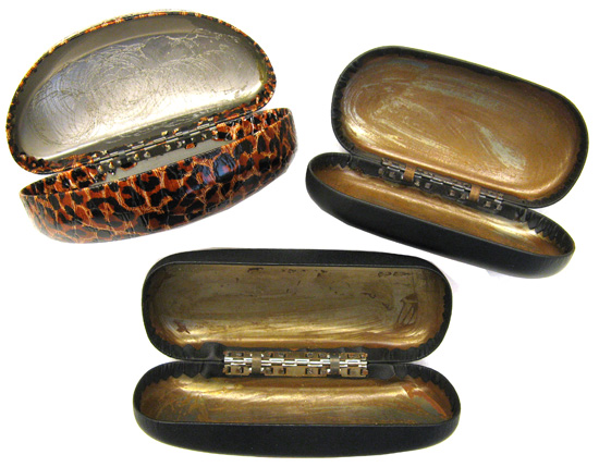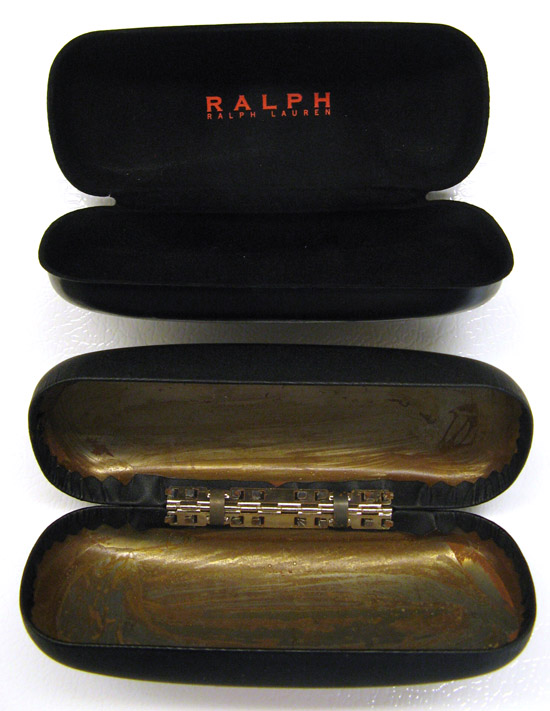 Reverse Engineering a Sunglass CaseTo begin, several commercial sunglass cases were purchased. The cases chosen are a representation of many of the commercially available styles, shapes, sizes and construction for this hard style case. The first step was to separate the liner from the hard outer shell. The liner was made from thin plastic and had a smooth outer face and soft inner surface where the glasses will contact. The case was made from tempered steel and held together by a miniature piano hinge. Upon dissembling the three sunglass cases, it was evident that they all had the same style of construction and possibly shared a similar style of manufacturing. The shells appear to be stamped from tempered steel or the hardness may have been a result of work hardening during stamping. Measuring the wall thickness of the case showed that the case material was approximately 30 gauge which corresponds to a thickness of 0.0120". Other gauge thicknesses were ruled out as 29 gauge is 0.0135" and 31 gauge is 0.0105." This thinness of material further supports the steel being heat treated in some fashion to increase its strength, as untreated steel this thin is fairly flexible. A close up of the hinge identifies two important aspects of the design. (1) How the hinge was attached to the steel shell halves and (2) the spring mechanism to hold the shells closed, but also limit the total angular excursion. The hinge was mechanically fastened to the shell with folded tabs of the outer shell through the hinge to form a compression joint. The springs are C-shaped and attach to cutouts in the hinge, the spring constant determine the force required to open the case. The sunglass case from the backside shows the tabs of the shell folded over to the inside of the case where it mechanically fastens the hinge firmly in place.