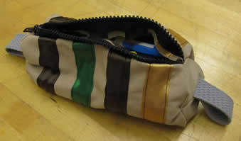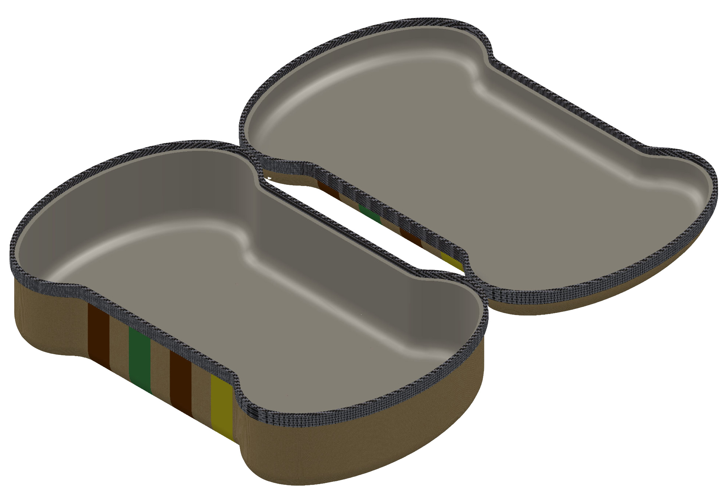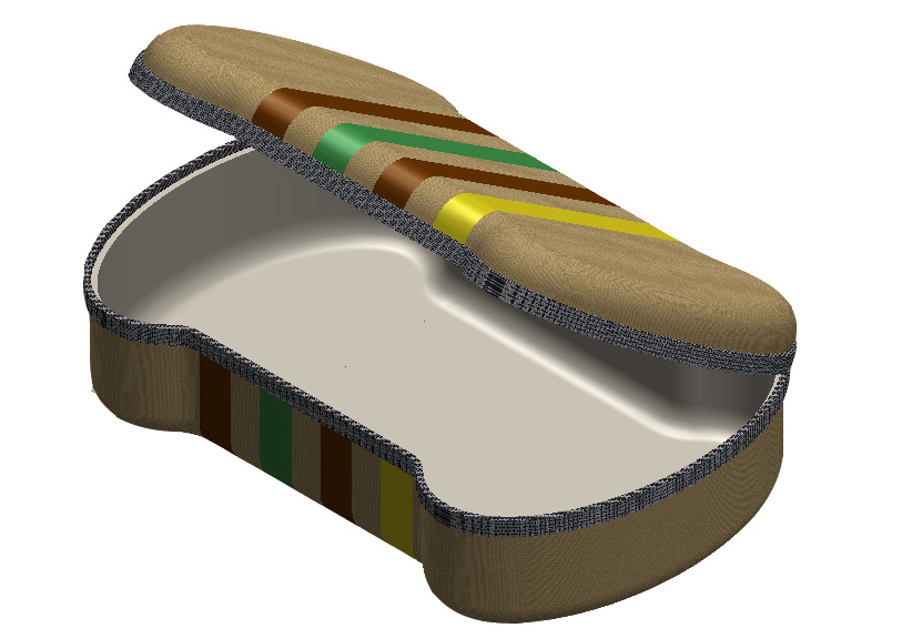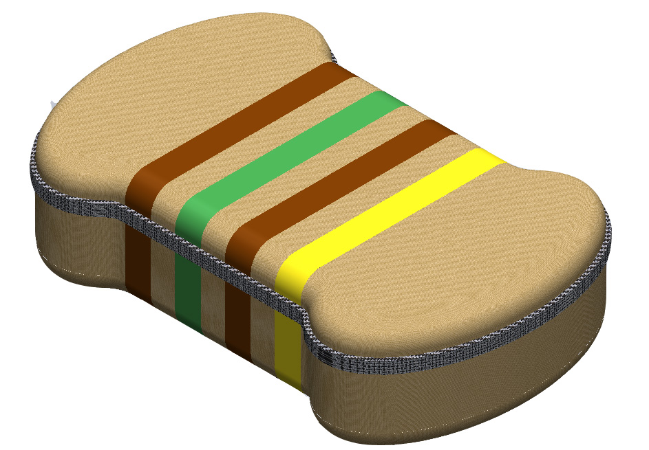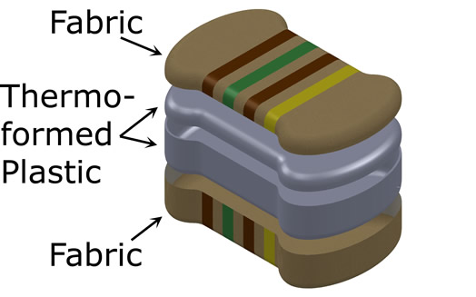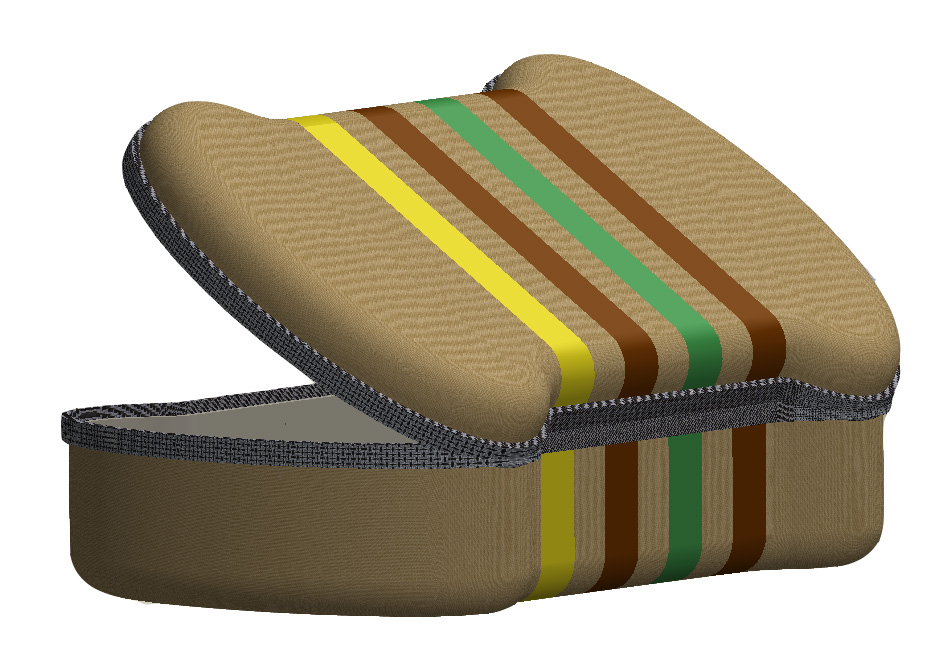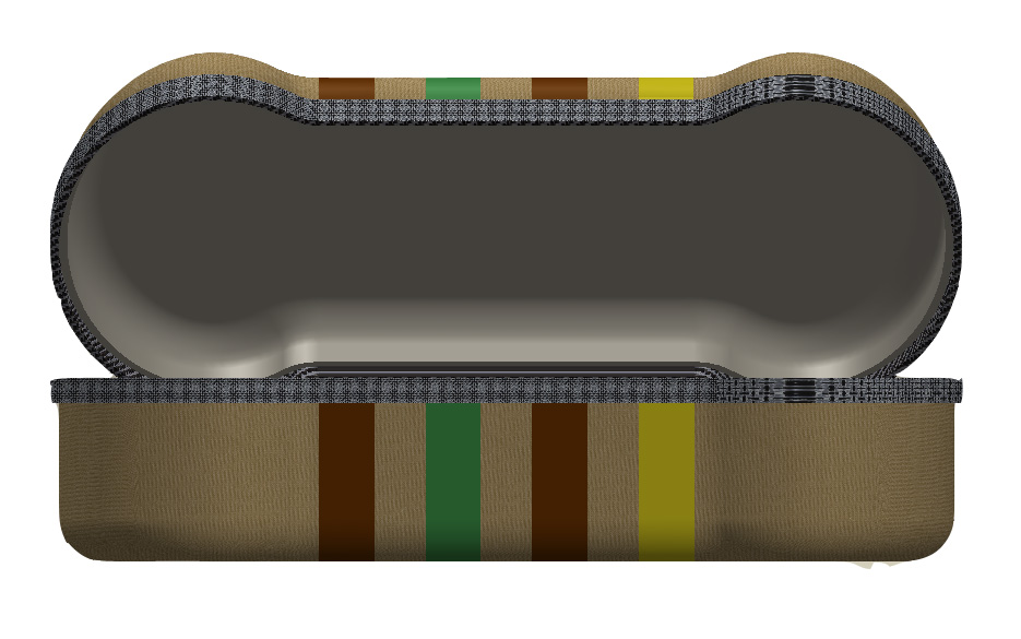 Inspired by the two cases above, I preceded to solid-model the images below for a semi-rigid fabric coated pencil case in the shape of a resistor's cross-section. The two halves of the 'clam shell' would be made of thermoformed plastic that is coated on one side with fabric. The hinge between the two halves would be made of fabric and the entire case would be securely closed with a zipper. The current resistor band colors represent a standard 150 ohm resistor sticking with a little bit of the MIT 150 theme. (Please forgive what looks like very poor quality images. When I resized the images to fit on this page they became very grainy and I don't know why. A PDF of just the content on this page is linked here and the images look much better.)