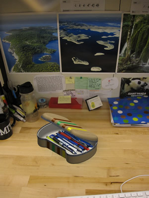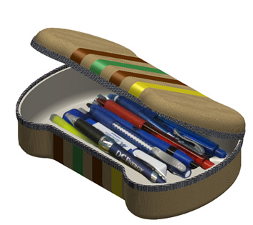 While the above solid model is informative, in order to have a good idea of what this case would look like at the correct scale and possibly in use. I rendered an image of the pencil case filled with pens and pencils on the surface of a desk. This rendering really gives a good idea of what the final product would look like in use and at scale.