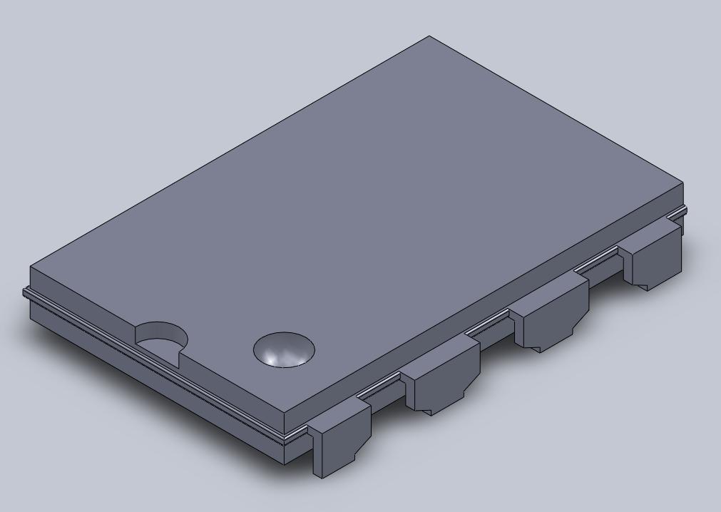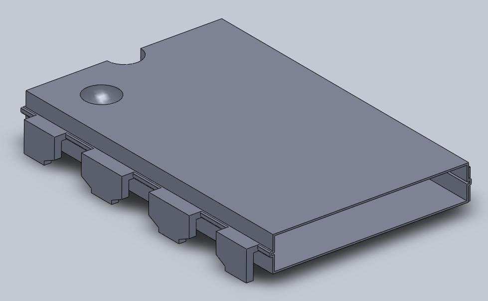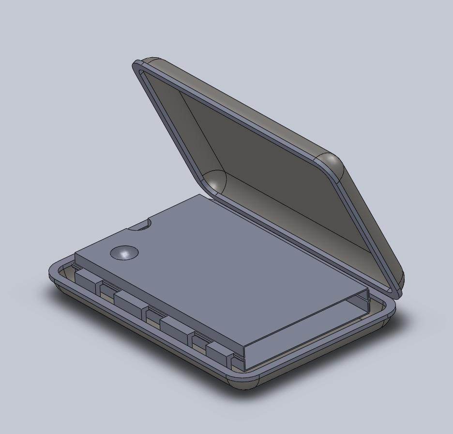 Microchip External Hard Drive Case: Solid ModelingExternal hard drive cases come in many styles, though most of them have a similar shape. They typically have a hard shell covered with rubber, fabric or leather, have a flexible hinge and are kept shut with a zipper or snap button. Some simple research and taking apart a case that was available, it appeared the simplest way to make a case like the ones shown above was to simply stamp sheet metal, aluminum or steel, into the desired form, and then glueing or stamping the internal and external materials onto the metal. A reasonable thickness for the walls of the case was around 0.1in. This was the thickness used in both the top and bottom halves of the case. The main modeling task came down to the microchip shaped pouch inside designed to hold the hard drive. This pouch would be made out of fabric or leather, and this is what it looks like on its own: As can be seen, the metal parts that would normally be attached to the circuit board is much shorter than an actual microchip's metal parts. This was to allow for a better fit inside the case and not make the case too thick. The pouch is measured at 3.5in wide and 5.5in long, just larger than a standard 2.5in external hard drive. These measurements were obtained by measuring the dimensions of a regular hard drive pouch made to protect drives from surface scratches. All put together, the solid model of the external hard drive case looks like this: Note: the fabric/leather hinge and zipper are not represented in this model. |
