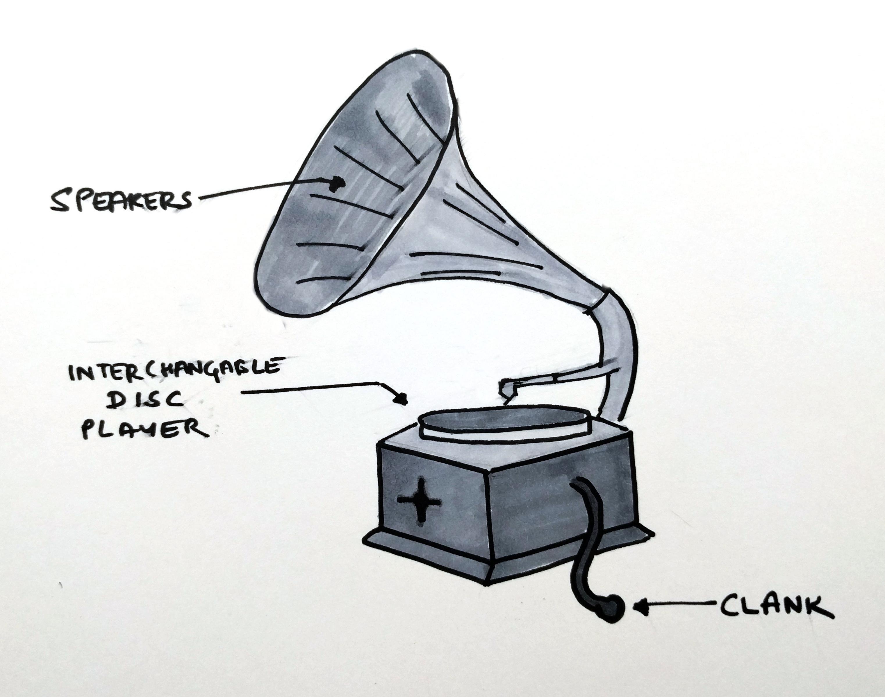 An old gramophone fits the scene and can be used in conjunction with a puzzle. The clank can be connected to an electronic trigger. An old gramphone can be retrofitted with electronics for the purposes of this gag.