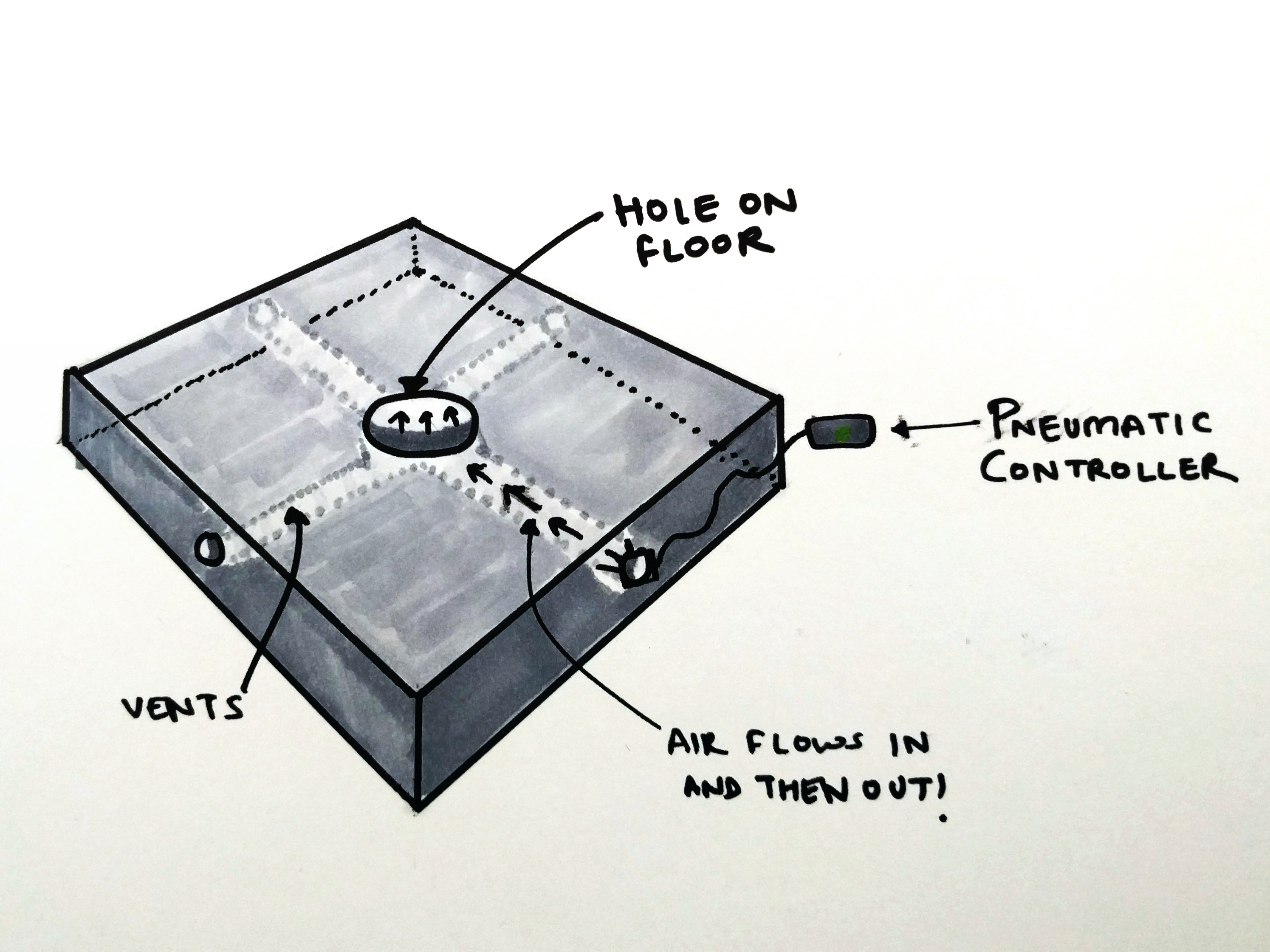 In the spooky mansion, mice run around in response to lightning and other events. A hole in the floor blows up air, actuated through vents by a simple pneumatic pump controlled by a remote circuit. This gag provides a scary effect, consistent with the theme, and shouldn't be too hard to build.
