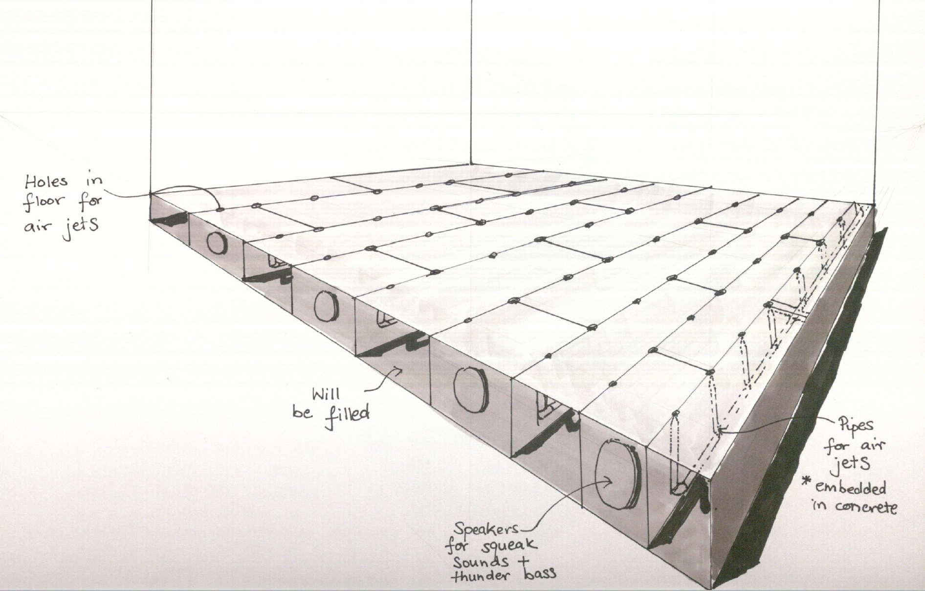 I imagine the floor retrofitted with holes and valves to produce controlled air jets which if synchronised correctly with speakers and bass will provide the explorer with the effect of mice running on and near their feet. The floor will also be fitted with speakers to provide the 'squeeky sounds' from beneath and also provide little feet running erratic effects.