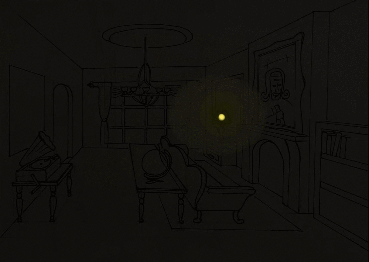 A dim light shines in the corner. Lightning illuminates the room.