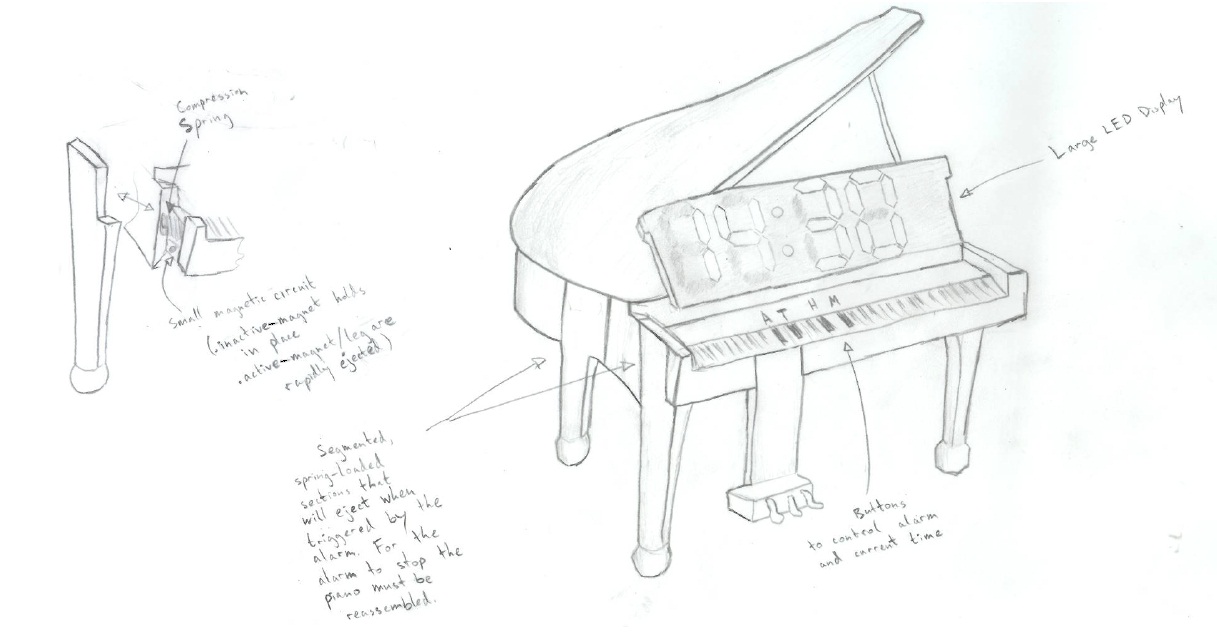The Baker Piano Clock commemorates drop date at MIT, the last day to drop a class with no penalty. In order to avoid missing early morning classes (and thus avoid the need to drop them) this alarm clock will force you up. The alarm will trigger a controlled demolition of the piano and continue to ring until the parts are put back in place!