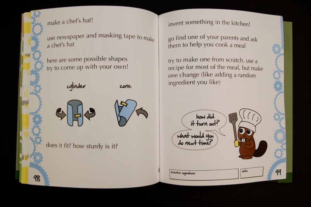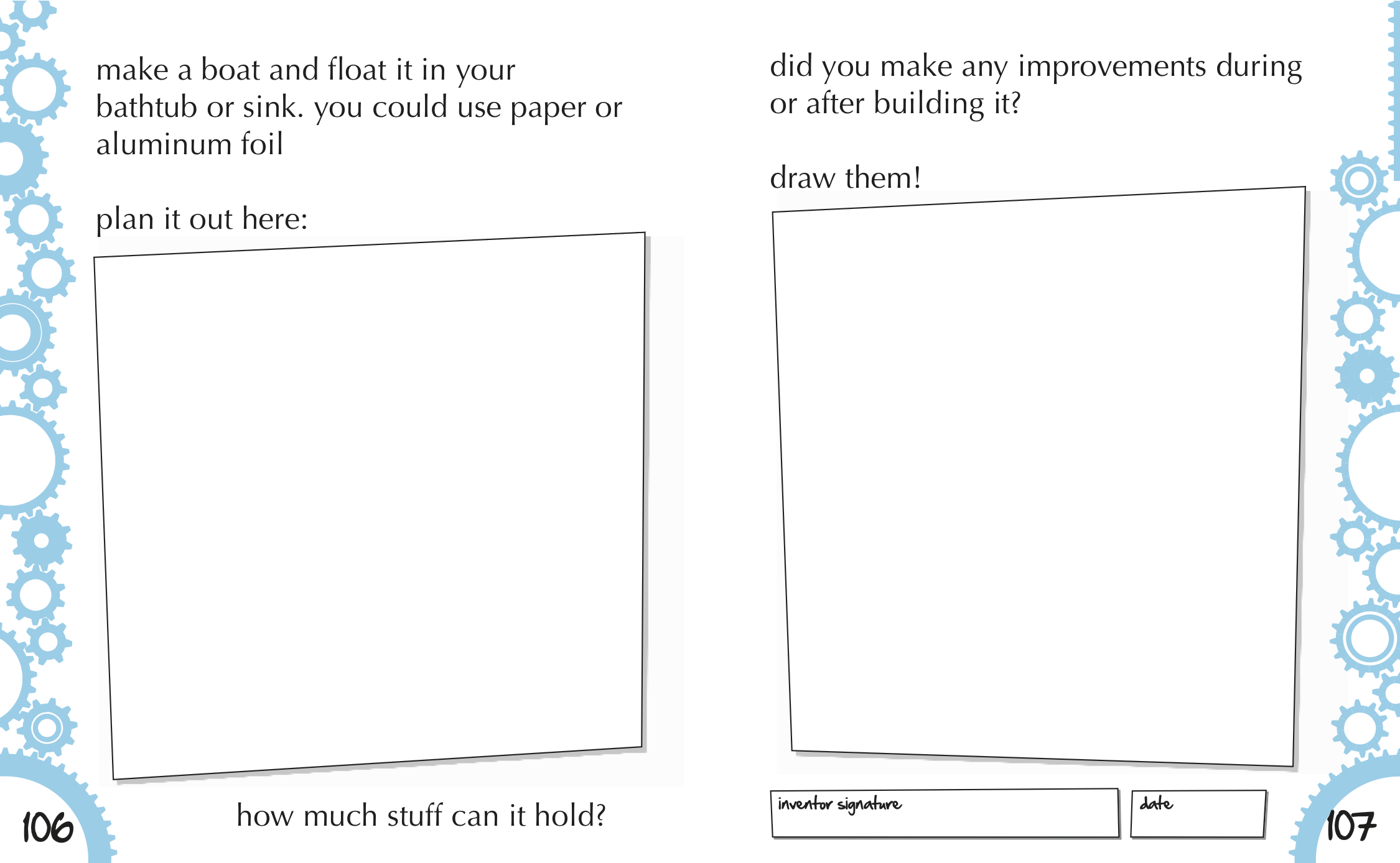 The other kind of prompt is more open-ended and incorporates drawing as a means of teaching planning and iteration. Before a child builds a product, he or she is given space to draw (or plan) out the concept beforehand. This draws in from all other sections of the book — the child must ideate and invent a concept, but also communicate it through good drawing. After the child has completed his or her design, there is the opportunity for iteration. The book asks questions to have the child reflect on what he or she has created. For the chef’s hat, does it fit? For the boat, does it float? Additionally, the book encourages the child to make improvements and design new versions of the product. This way, the child is not limited by one design, and isn't finished after he or she makes one model of the product.