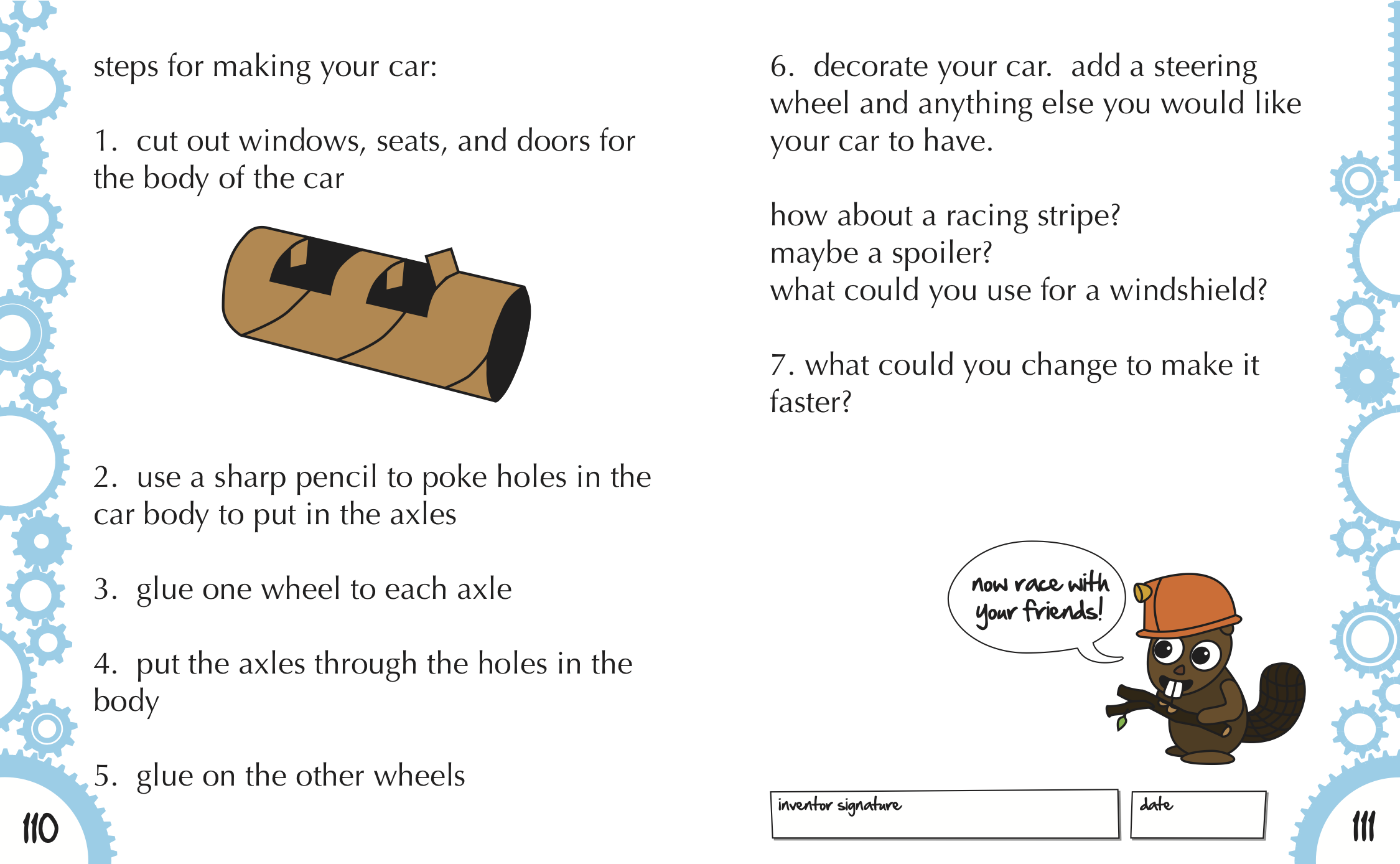 The building section intends to take the user outside the book in the last stage of invention. Immediately, the layout of the book changes. The beaver, our guide through the invention process, is now ready to build, equipped with a hardhat and twig. The border of the book also changes, from lightbulbs symbolizing new ideas, to gears, symbolizing movement and machinery.