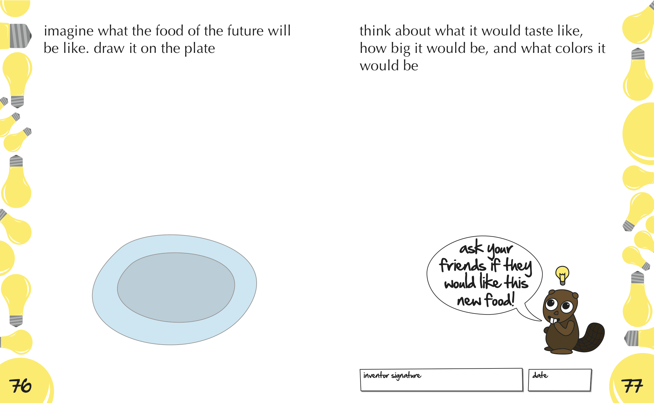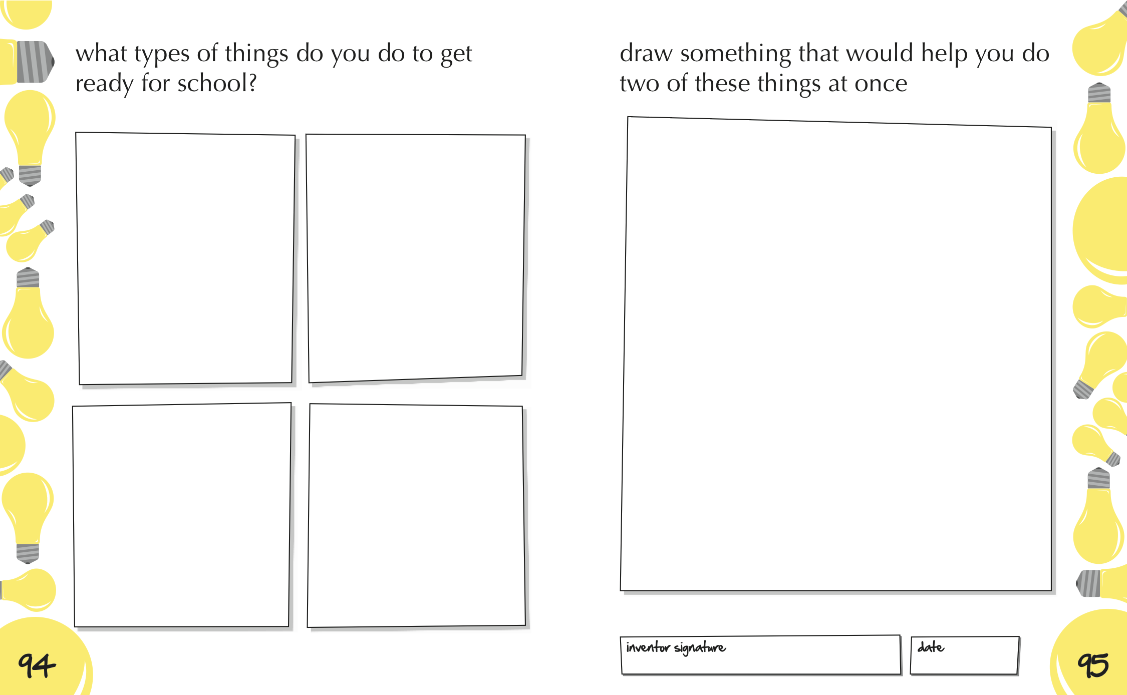 This section was carefully crafted to have a broad range of structured to open-ended problems. We wanted to start the children off with a basic framework of invention and then let them really get creative. The “inventor signature” box on the bottom of each page is particularly important in this section. In testing, the children were very proud of their ideas and took ownership.