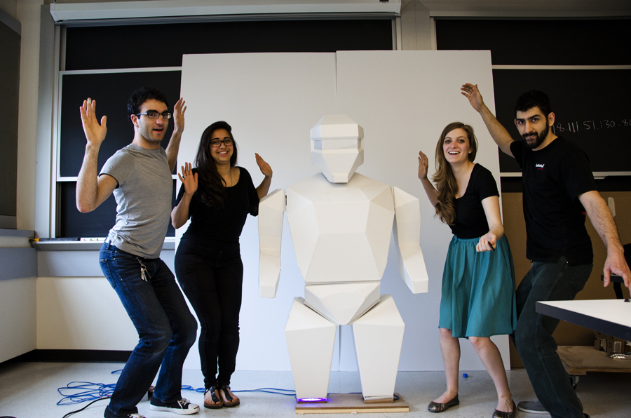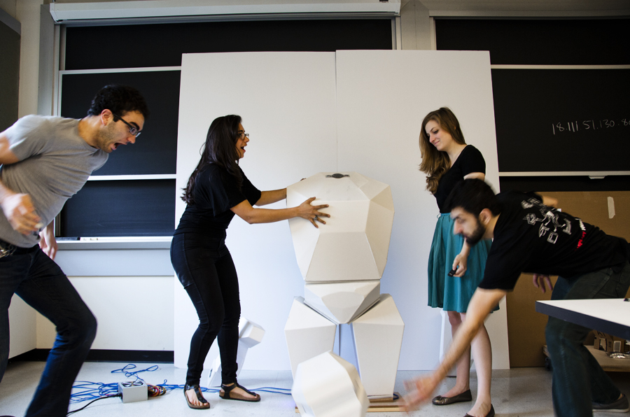 For this prototype, we used folded foam core to create Percy’s faceted geometry. Because of this, the pieces were fairly weak and did not stand up well to abuse or drops. Additionally, the imprecision of foam core resulted in inaccurate connections and alignment of joints. For future production, we recommend creating molds and using fiberglass to create the robot components. This will result in much stronger parts with better resolution and smaller tolerances. We would also like to fabricate each component such that it easily opened, in order to allow for access to internal components and circuits.