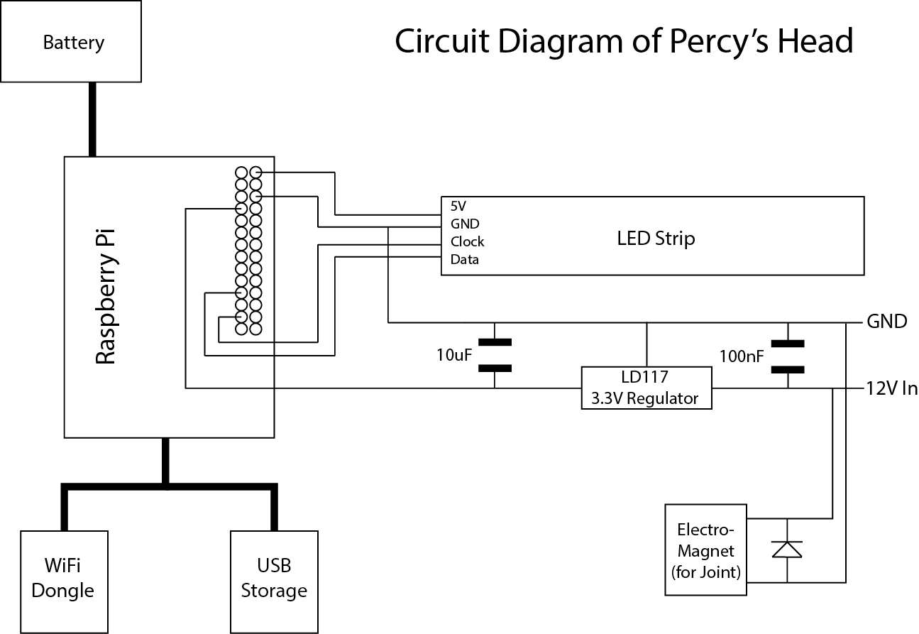 The LEDs are controlled using the WS2801 protocol and are connected to a Raspberry Pi controller via the SPI GPIO pins. The LEDs have full 24 bit RGB color available and can achieve an extremely high framerate (over 60 fps), though they are generally limited to roughly 20 fps given the size of the audio time step. An example strand that would work for Percy is this strand on Amazon. Alternatively, if you only wanted one color of light in Percy's head, you could use a single color LED strand and modulate the power using PWM and a power transistor. Scaling the PWM duty cycle with increases in speech volume will produce the same effect.