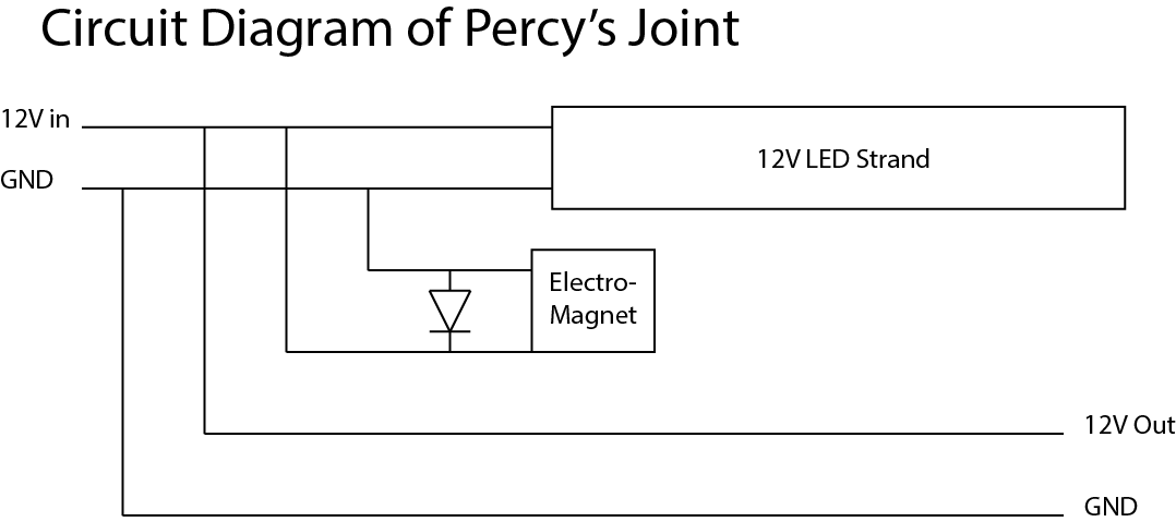 In order for Percy to stay put together, his body is powered from the bottom with a standard 12V power supply. This power supply provides power to both the electromagnets in the joints and the LEDs. Since each electromagnet draws half an amp, and each small LED strand in a joint draws roughly 0.1 amps, the total amount of amperage needed is 0.6A per joint. This value increases as you add more LEDs to the joint or increase the strength of the electromagnets.