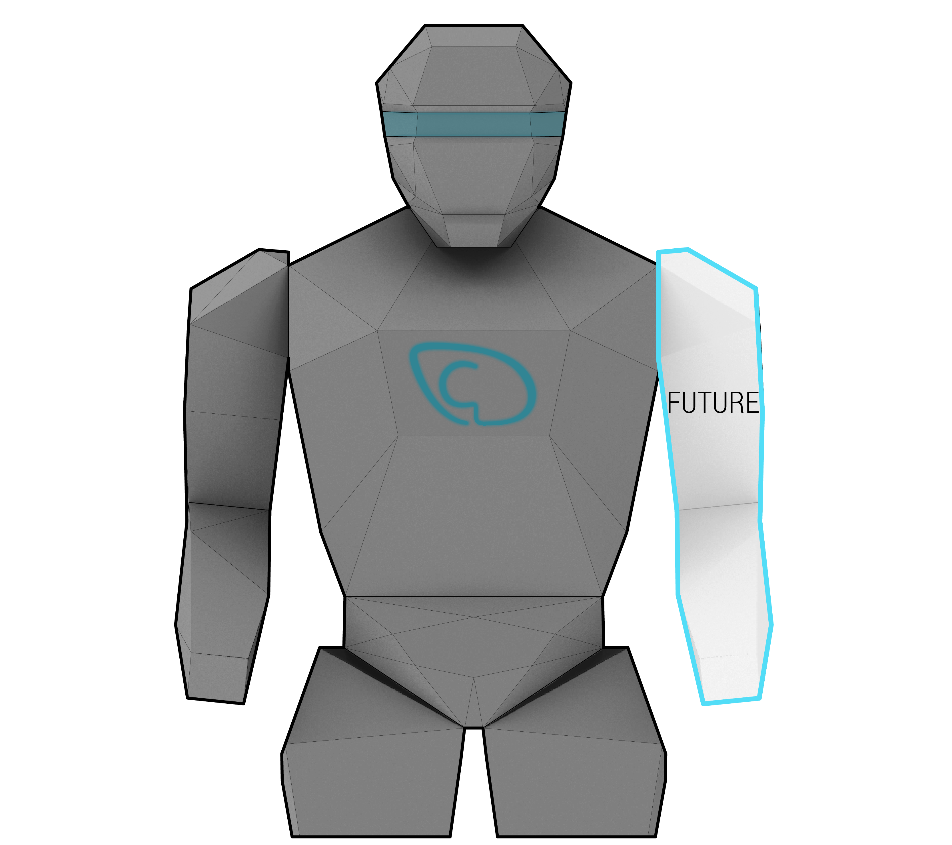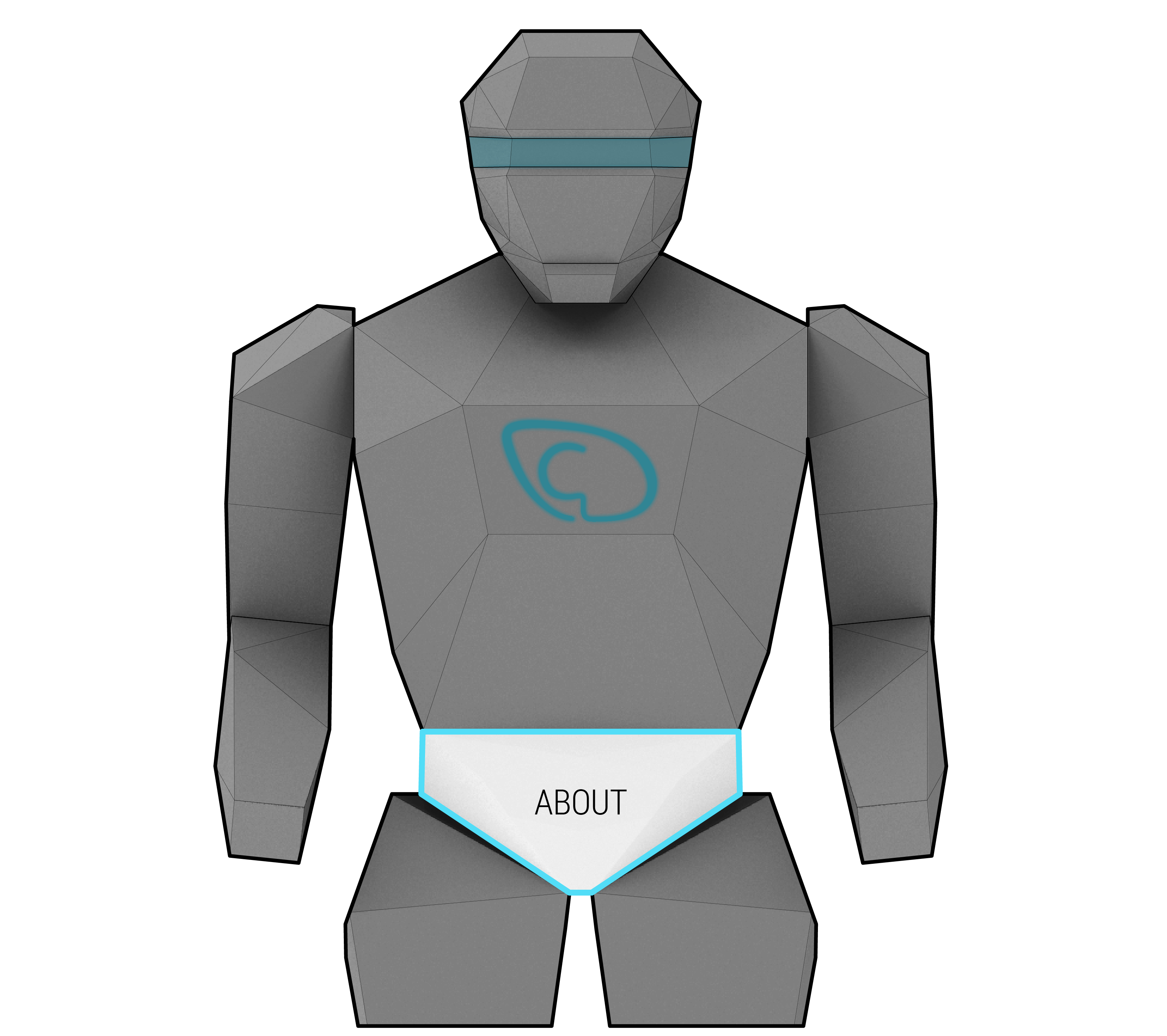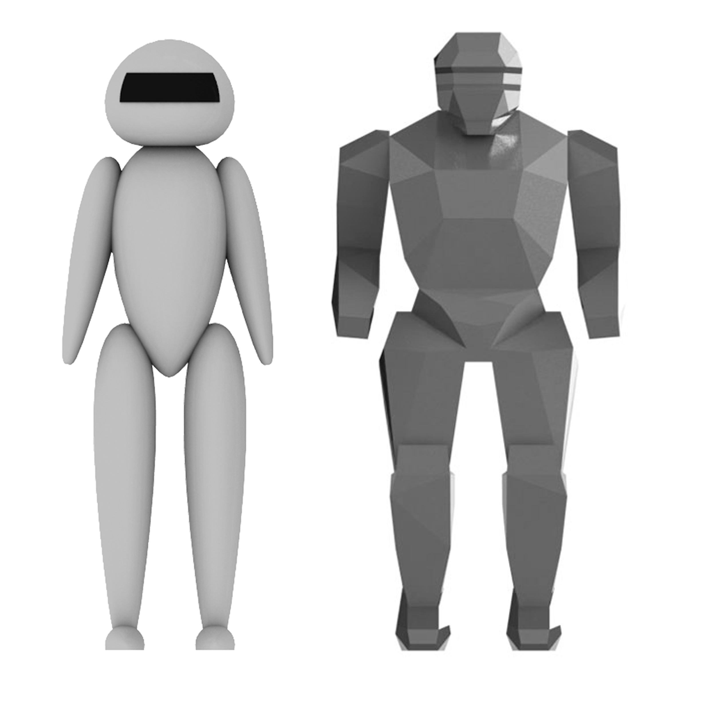 We initially designed Percy in a faceted form, but user feedback indicated that this form seemed agressive and scary, not the emotions we wanted to convey for our robot ally. We developed a second design composed entirely of C2 curvature to communicate friendliness and hi-tech sophistication. We conducted user interviews and found that this new form came across as too friendly and not as a robot that could protect the 5W!TS visitors once it was assembled. From this feedback we decided to continue with the faceted form, but we updated the geometries to be less angular and to communicate a strong and lean body for our robot instead of the bulky and overly muscular original form.
