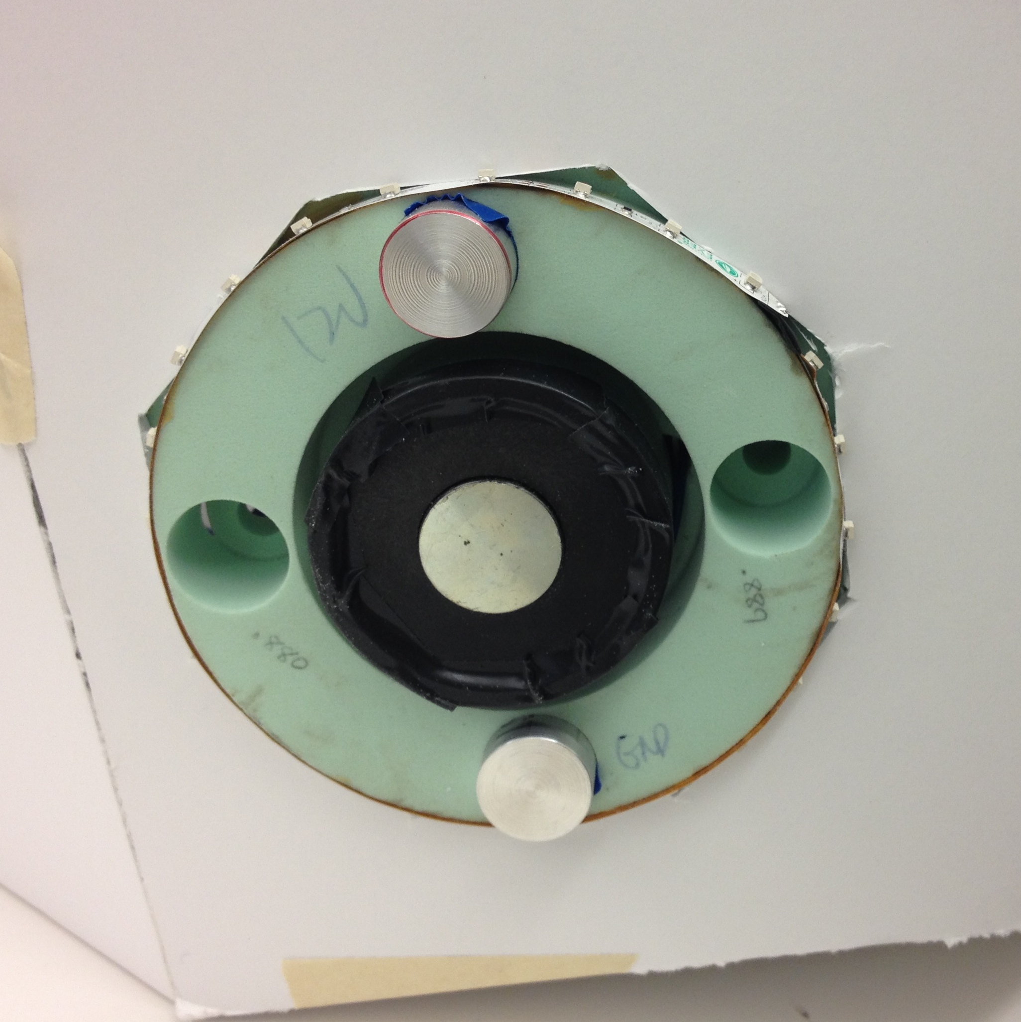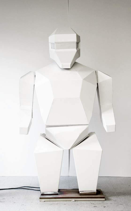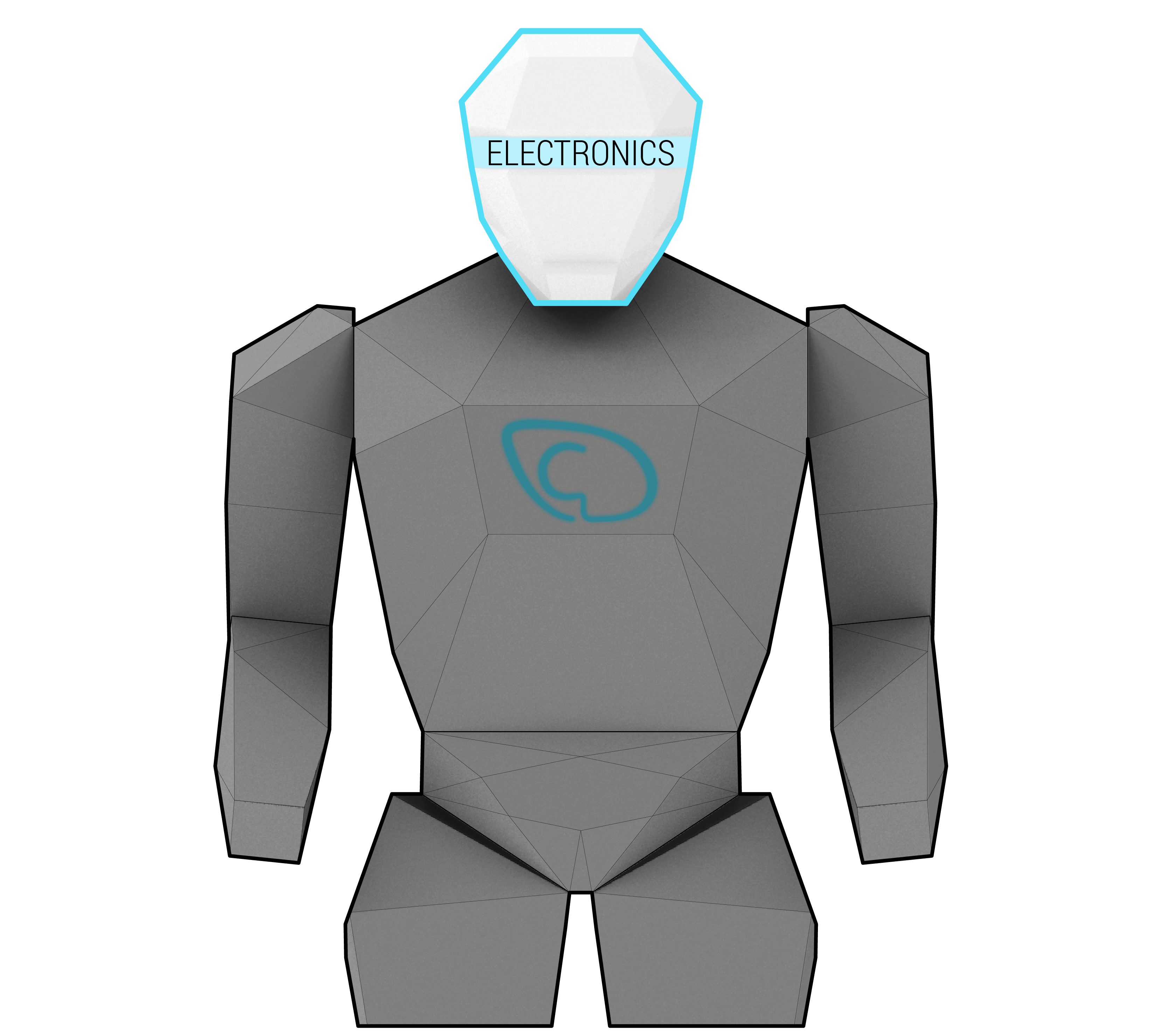 As joints are assembled corrected, the aluminum contacts complete the circuit within that joint. This causes the LEDs to light up, indicating a correct match, and it also activates the electromagnet, holding the joint together. Power is supplied through the fixed robot feet in the floor, and is translated to each robot part as it is added to the robot assembly by 5W!TS visitors. The head is the only part that needs to be powered while it is separated from the robot body, so we installed a battery inside to drive the head LEDs.