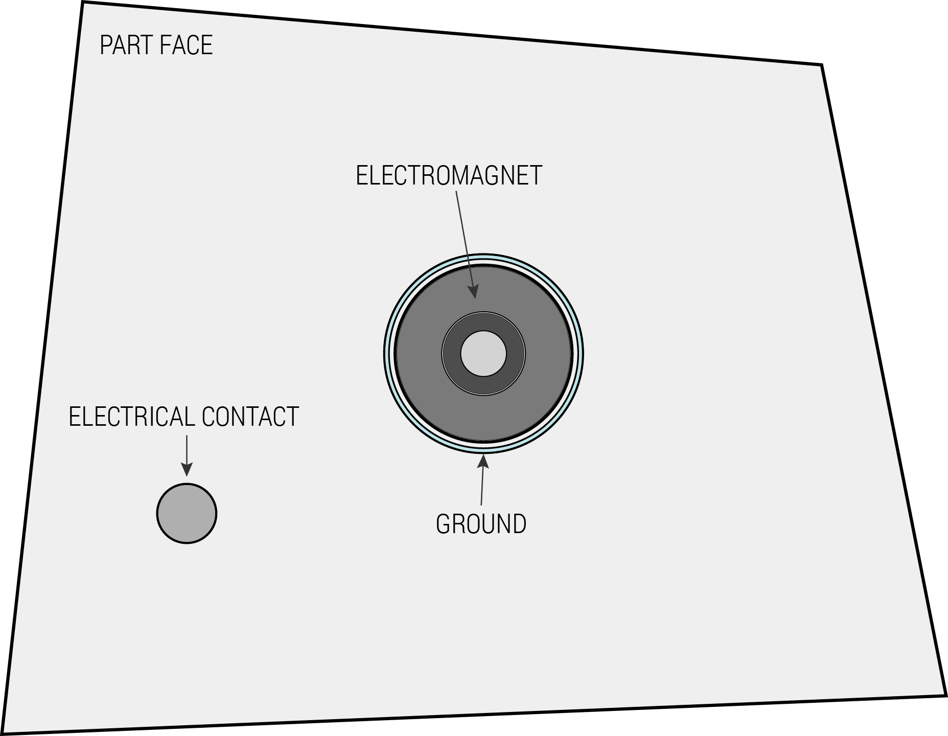 Our initial joint design did not have the spring loaded contacts mentioned in the concept refinement phase because a lack of off-the-shelf parts meant that we were time-constrained. We found that relying on precision component assembly was not very effective and that the added contact made alignment even more difficult. A future iteration of this joint would place a grounded sleeve around the electromagnet and a single contact for the positive rail of the power supply as illustrated in the figure below.