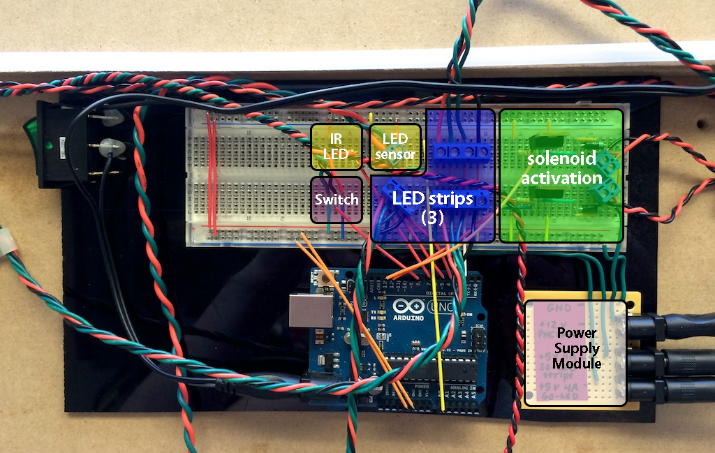 This simple IR sensor diagram provided the basis for the IR module on the breadboard. Adafruit's thorough documentation of their addressable LED light strip helped us understand circuit design and data transfer requirements. Adafruit's power supplies were a key component - these LEDs can draw substantial current (up to 3.6A on the circumferential strip and 1.2A on each door edge strip), but are limited to 5V. Correct, safe, and consistent power supply for this system is vital for this design. The solenoids used require a 12V supply, our third power supply shown in the power supply module.