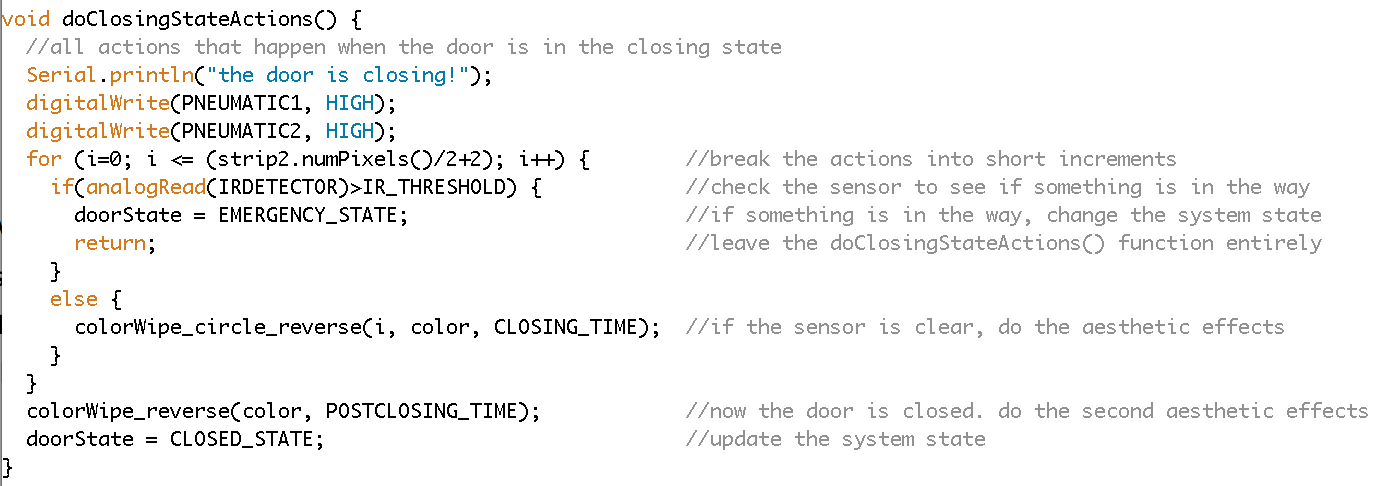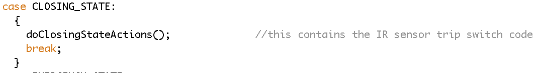 IR Sensor Trip Switch: This case is a bit more tricky. Here we want the state action functions (for the closing state, specifically) to execute, but we also want the IR Sensor Trip Switch to cancel those actions and force the system to the next (emergency) state. To do this, we incorporate an IR sensor check into the state action function, making sure that the state action function does is sliced up into a loop that constantly checks the IR sensor before each small step. The guideline here is that the loop time needs to be FASTER than the time it would take an obstruction/person to move past the trip switch (but then again, honestly if something moves by that fast it probably won’t get squished by the door!). If the trip switch is ever triggered, the new system state is defined and the function is exited immediately. If not triggered, the function will run its normal course.