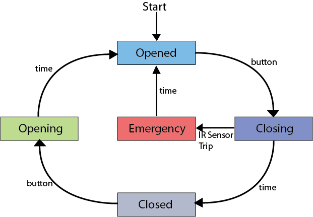 We designed a simple state machine to control the door system, with a focus on flexibility surrounding a core emphasis on safety. There are five states to the system (opened, closed, opening, closing, and emergency) which are shown in the diagram below.