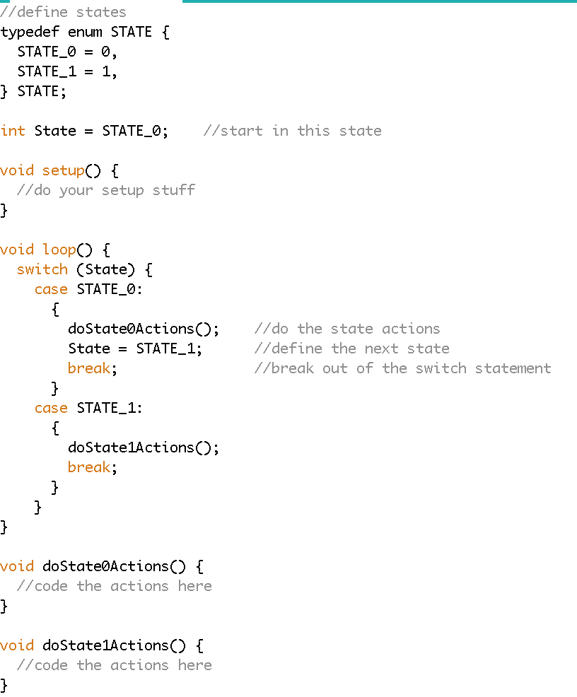 From a coding/control perspective, the advantage of a state machine design is that it decouples the system into independent, editable pieces. A state machine starts with a switch statement to determine the active state. Each state begins by executing the actions of that state, and ends by telling the system which state it should do next. To keep the code clean and clear (and thus easy to communicate amongst a team of designers), the state structure is defined in the main program loop and the state actions are defined outside of the loop in their own functions. The main program loop can be written entirely from the simple diagram shown above. Once completed it can be left alone, and all performance changes can be made in the state action functions.