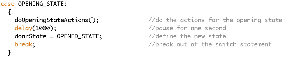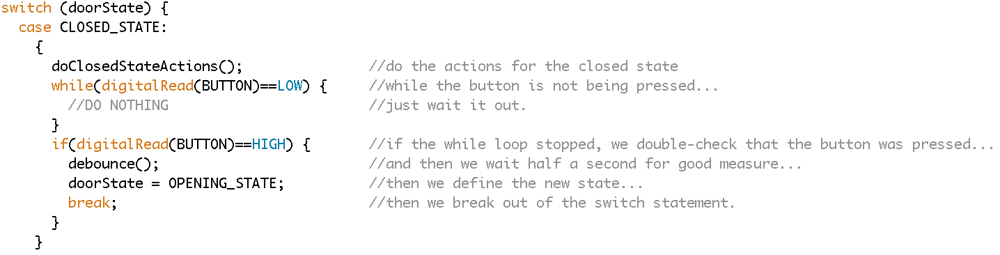 Buttons: In the case that the system should wait until a button press to enter a new state, a simple while loop is used to pause the system. After the while loop is broken by a button press, a debounce() function is often a nice trick to make sure the button doesn’t trigger multiple times and cause issues. (debounce() is really just a fancy way of saying “wait for half a second after the button is pressed”) The example below shows how the system goes from the closed state to the opening state on button press.