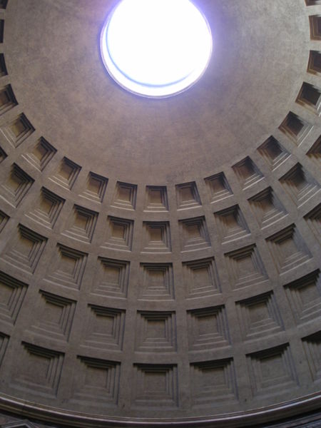 The interior of the dome contains coffers, small niches cut out to make it lighter. They are a necessary architectural concession because the dome has no internal supports. In the very top of the dome is a 9 meter diameter circular opening called the oculus, around which are five rows of ceiling coffers. The height of the circular opening from the floor is 43.2 meters, the same as the inner diameter of the room. In order to build a free-standing dome, the Romans not only used lighter stones as they approached the top, but also the walls become progressively thinner to a thicknes of only 1.2 meters around the oculus. |