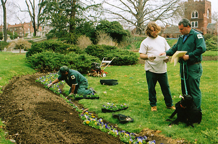 Santiago (aka Tudi) continues to plant pansies in the Asa Gray Garden