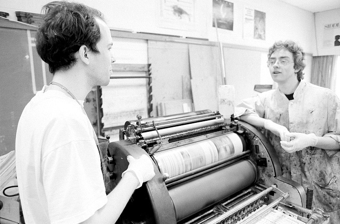 | Watching a press in operation is sort of like watching a cuckoo clock run at full speed, and there are often mechanical hiccups and quite a bit of cleaning. It helps somewhat to do several weekends' posters at once. This, at least, means that "there's a lot less cleaning," Rolfe says. The work is a good break from from his computer science studies. "Working with machinery - presses - is rather different" from his usual work. |