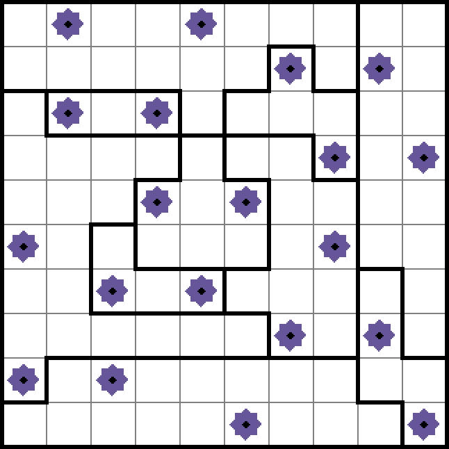 In a Star Battle puzzle, a n×n grid is divided into n regions. To solve the puzzle, the player must find a placement of 2n stars such that each row, each column, and each region of the puzzle has exactly 2 stars, and no stars are vertically, horizontally, or diagonally adjacent. Other size variations are possible, but we’ll use 10×10 2-star puzzles for this project. We will also assume that valid puzzles have a single unique solution.