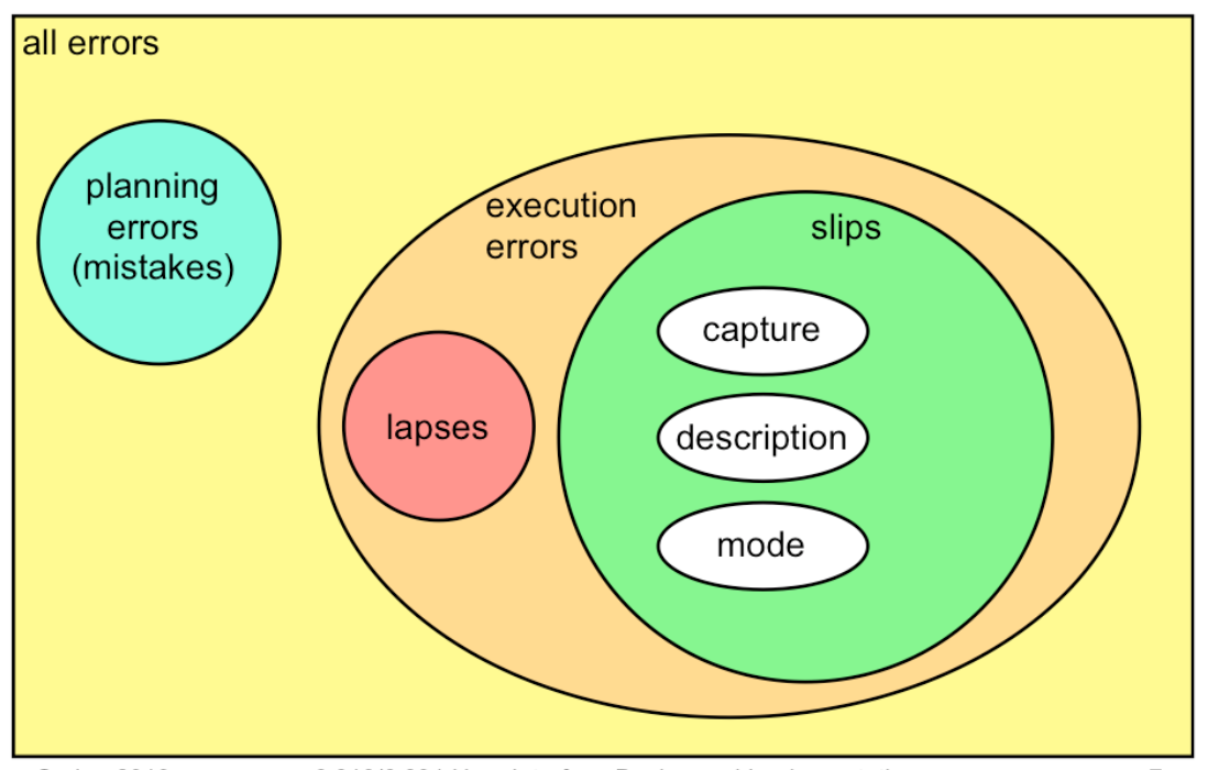 Here's a Venn diagram that shows the classification into mistakes and slips/lapses, with a finer categorization of slips discussed below.