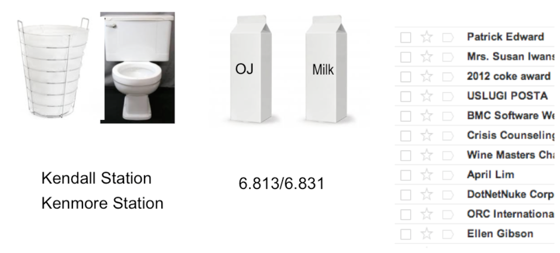 Some other pairs that may be prone to description slips are shown above. In the GMail interface on the far right, the three icons - checkbox, star, and important - look very similar to each other when unchecked, opening the way to description slips.