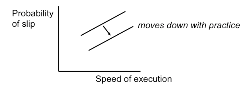 Here are some examples of common slips. A **capture slip** occurs when a person starts executing one sequence of actions, but then veers off into another (usually more familiar) sequence that happened to start the same way. A good mental picture for this is that you've developed a mental groove from executing the same sequence of actions repeatedly, and this groove tends to capture other sequences that start the same way. In the text editor vi, it's common to quit the program by issuing the command ":wq", which saves the file (w) and quits (q). If a user intends just to save the file (:w) but accidentally quits as well (:wq), then they've committed a capture error. Microsoft Excel has a curious (and very useful!) class of formulas called array formulas, but in order to get Excel to treat your formula as an array formula, you have to press Ctrl-Shift-Enter after you type it - every time you edit it. Why is this prone to capture slips? Because virtually every other edit you do is terminated by Enter, so you're very likely to fall into that pattern automatically when you edit an array formula.