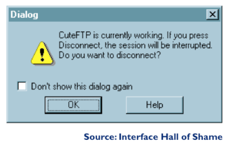 - If a confirmation dialog is frequently seen - for example, every time the Delete button is pressed - then the expert users will learn to expect it, and will start to include it in their habitual procedure. In other words, to delete something, the user will learn to push Delete and then OK, without reading or even thinking about the confirmation dialog! The dialog has then completely lost its effectiveness, serving only to slow down the interface without actually preventing any errors.