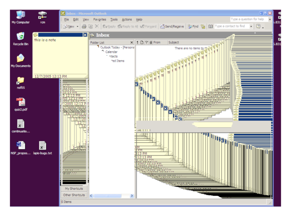 What else is wrong here? As the screenshot shows, the animation wasn't even done properly - instead of animating using automatic redraw, Outlook paints the moving note directly on the screen, leaving a smear behind it. Notice that the smear is visible in some parts of the Outlook window, but not in others. Why do you think that is?