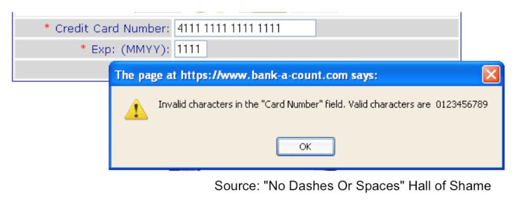 The figure shows an example of an error message that simply shouldn't happen. Forbidding dashes and spaces in a number that the user must type, like an account number or credit card number, is poisonous to usability. (Why are dashes and spaces helpful for human perception and memory?) There's a great collection of error messages like this at the No Dashes or Spaces Hall of Shame (http://www.unixwiz.net/ndos-shame.html).