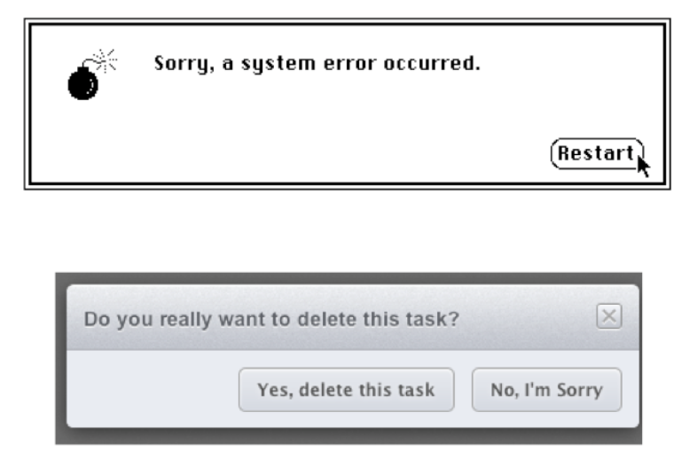 Finally, be polite. The message should be worded to take as much blame as possible away from the user and heap the blame instead on the system. Save the user's face; don't worry about the computer's. The computer doesn't feel it, and in many cases it is the interface's fault anyway for not finding a way to prevent the error in the first place. It's interesting to contrast what the original 1984 Mac said when it crashed (an apology!).