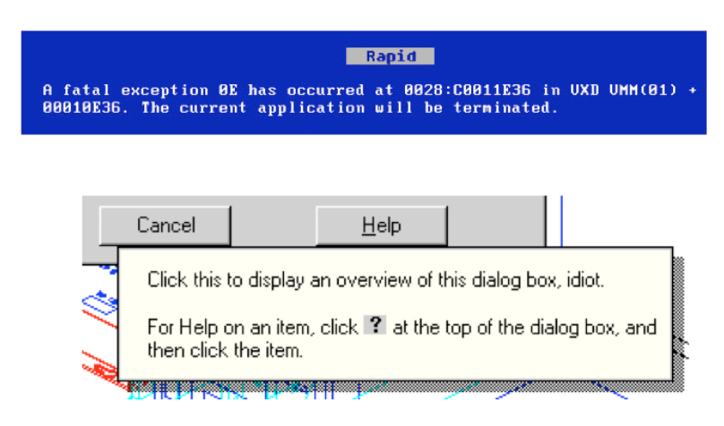 The tooltip shown at the bottom isn't strictly an error message, but it actually appeared in a production version of AutoCad! As the story goes, it was inserted by a programmer as a joke, but somehow never removed before release. Even as a joke, it demonstrates a lack of respect for the intelligence of the human being on the other side of the screen. That attitude is exactly wrong for user interface design.