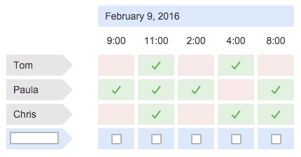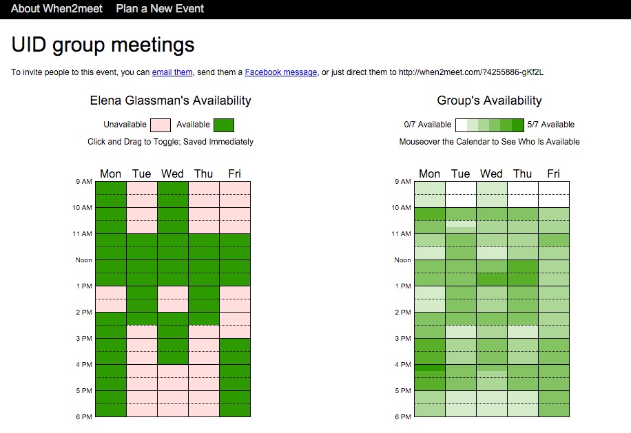 This is a snapshot of When2meet, one of the various web apps currently available for scheduling meeting times. The meeting coordinator is scheduling a weekly meeting, and has asked group members to enter their availability.