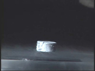 In this experiment, a small permanent magnet is suspended, in mid air, above a superconducting disk. The disk is immersed in liquid nitrogen to get it cold enough so that it superconducts.