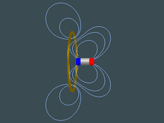 This applet illustrates the electromagnetic interaction between a conducting non-magnetic ring and a magnet, both constrained on a horizontal axis. From the "Actions" menu, you can choose between "Manual Mode" and "Generator Mode". In "Manual Mode", as you move the magnet or the ring (by clicking and dragging), the changing magnetic flux through the ring gives rise to a current which is in a direction such as to oppose the change in flux, as described by Lenz's Law. You can vary the resistance of the ring and the strength of the magnetic dipole moment to see how these parameters affect the resulting field, flux, and current. If the resistance is zero, the change in induced flux in the ring will exactly counter the change in external flux due to the magnet, thus keeping the total flux constant. Increasing the resistance hinders the flow of induced current, resulting in a delay in the response of the ring to the change in external flux, and a corresponding change in total flux. This can be seen in the flux graph as you manipulate the objects.